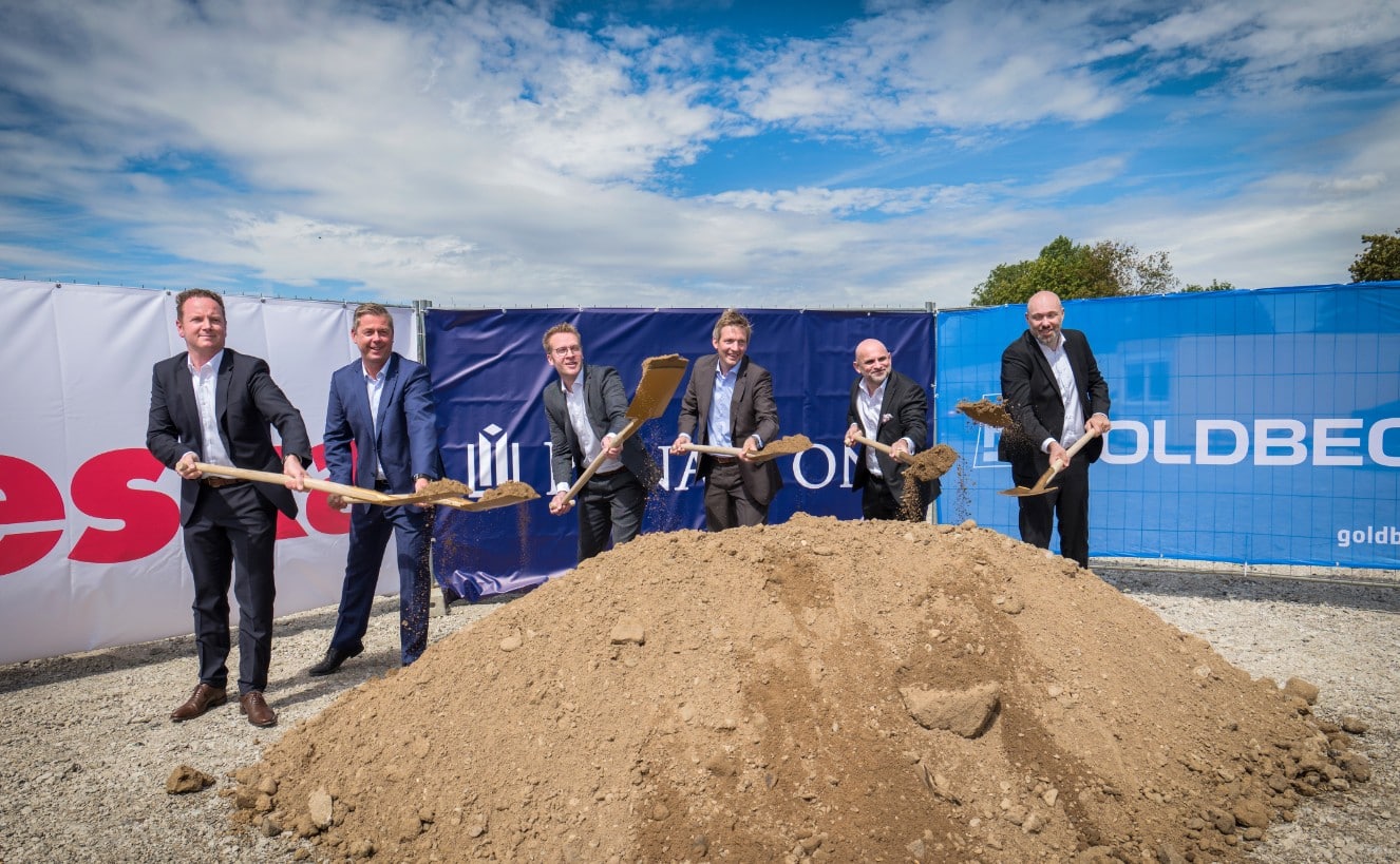 Image 2: Groundbreaking for the new warehouse and logistics center of the neska group/ Persons depicted from left to right: Jörg Strohmeier (MD GOLDBECK International), Stefan Bohn (MD Panattoni), Stefan Hütten (MD neska Group), Stefan Schmutz (Mayor of Ladenburg), Dr. Haunschild (Senior Vice President and MD BASF Colors & Effects GmbH), Alen Petrusic (Site Manager neska Mannheim)