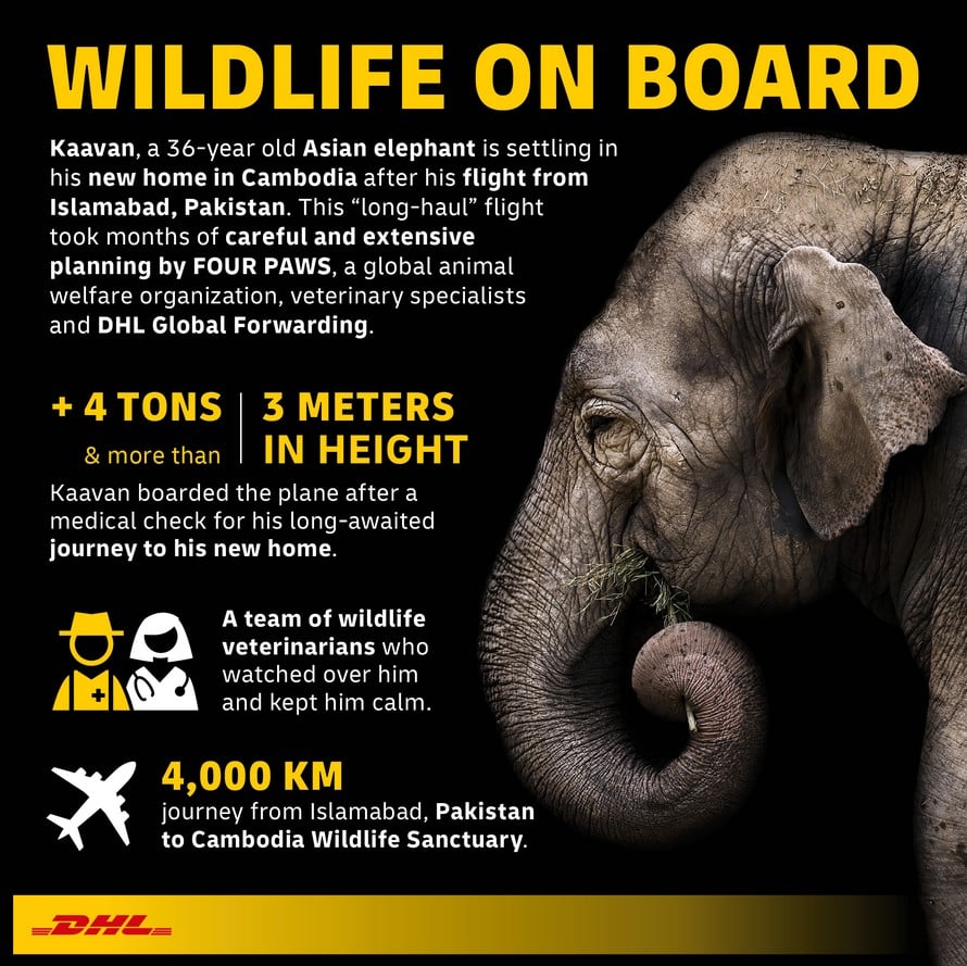 Dec 8, 2020 at 9:25 PMDHL conducted a spectacular transport of a living elephant from Islamabad/Pakistan to the Cambodia Wildlife Sanctuary in Cambodia. The careful and extensive planning for this long-distance flight took several months. The living conditions of Kaavan – also known as the loneliest elephant in the world – at the Marghazar Zoo attracted worldwide attention.