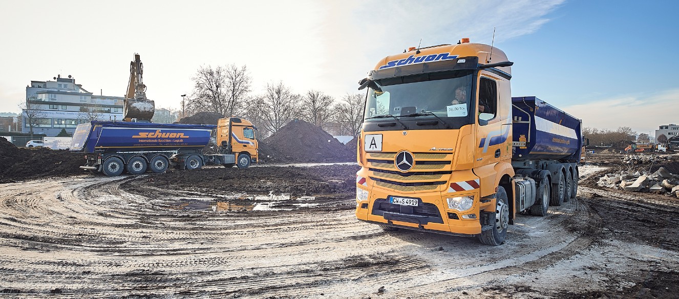 For many years, Schuon has been using trucks from Mercedes-Benz. “We have had the best experiences with them and are very proud that we are now involved in this representative mega construction project in Böblingen with the first two Actros tipping semi-trailers in our fleet,” says Frank Wohlgemuth, fleet manager of Alfred Schuon GmbH. “MirrorCam, safety assistance systems, Hydraulic Auxiliary Drive, and many other innovative features are indispensable for meeting the high demands of our operations, especially given the tight deadlines associated with this challenging clinic construction project.”
