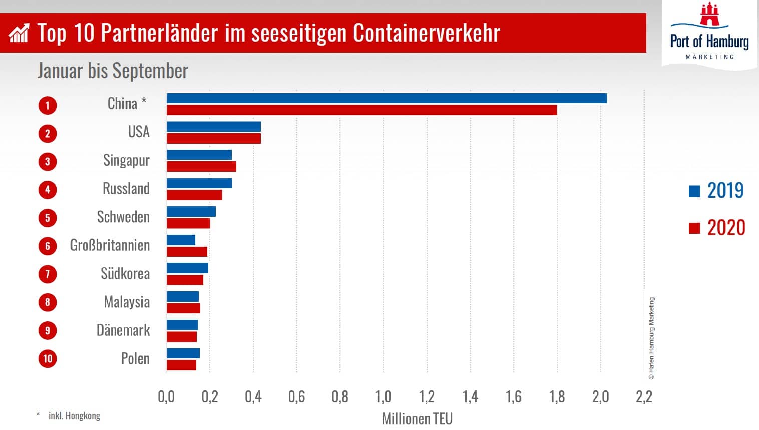 Among the trading partners with an increase in container traffic, the top 10 of the Port of Hamburg include the USA (+1.8 percent), Singapore (+5.3 percent), the United Kingdom (+28.2 percent), and Malaysia (+6.0 percent). For the USA, which ranks second in the container partner ranking of Hamburg, a record result of 591,000 TEU was achieved in 2020. “The consistently positive container traffic development with the USA is surprising against the backdrop of the economic performance affected by Corona and declining demand there. The positive development in container traffic with the United Kingdom rises to a record volume of 266,000 TEU and is attributed to increased transport for the German market and intensified deliveries to the UK before Brexit,” explains Ingo Egloff.
