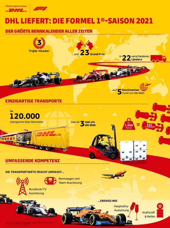 (Bonn) Just before the start of the new FIA Formula 1® World Championship, DHL and Formula 1® are pleased to announce the extension of their long-standing partnership. DHL will remain the official logistics partner of Formula 1® for the coming years and will continue to be responsible for the transportation of the premier class of motorsport around the world. In 2021, there are 23 Grand Prix, the most ever in the Formula 1® race calendar. For the globally held races, DHL transports the racing cars, team equipment, oil and fuels, as well as broadcasting technology. Since 2004, DHL has been the official logistics partner and has consistently won every ‘race behind the race’ for a timely execution of Formula 1® on Grand Prix circuits worldwide.