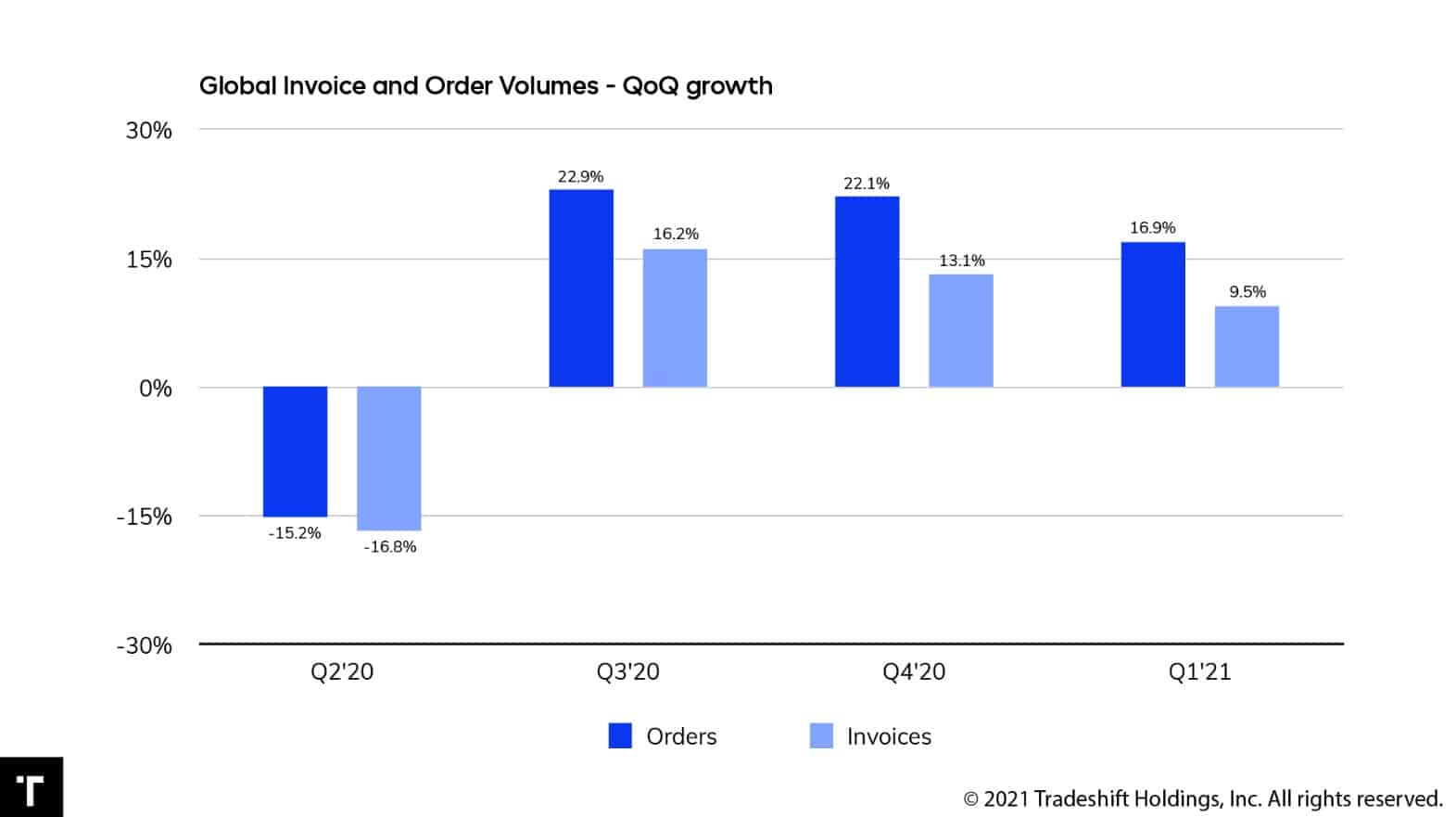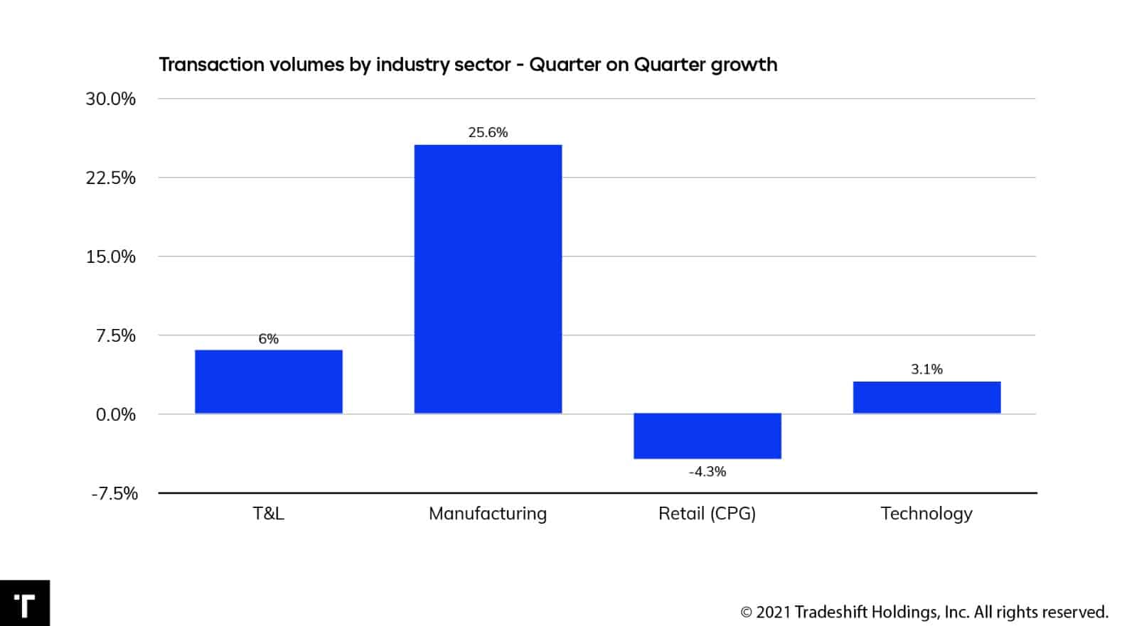 Apr 26, 2021 at 3:53 PMCompared to Q4 2020, the transport and logistics sector recorded a stable increase of 6 percent. Global B2B trade across sectors rose by 10 percent in Q1 2021, and the order volume increased by 16.9 percent. One in five suppliers reports difficulties in managing the rising demand. Almost a third of suppliers have experienced a deterioration in their cash flow position over the past six months. This is shown by new transaction data from Tradeshift.