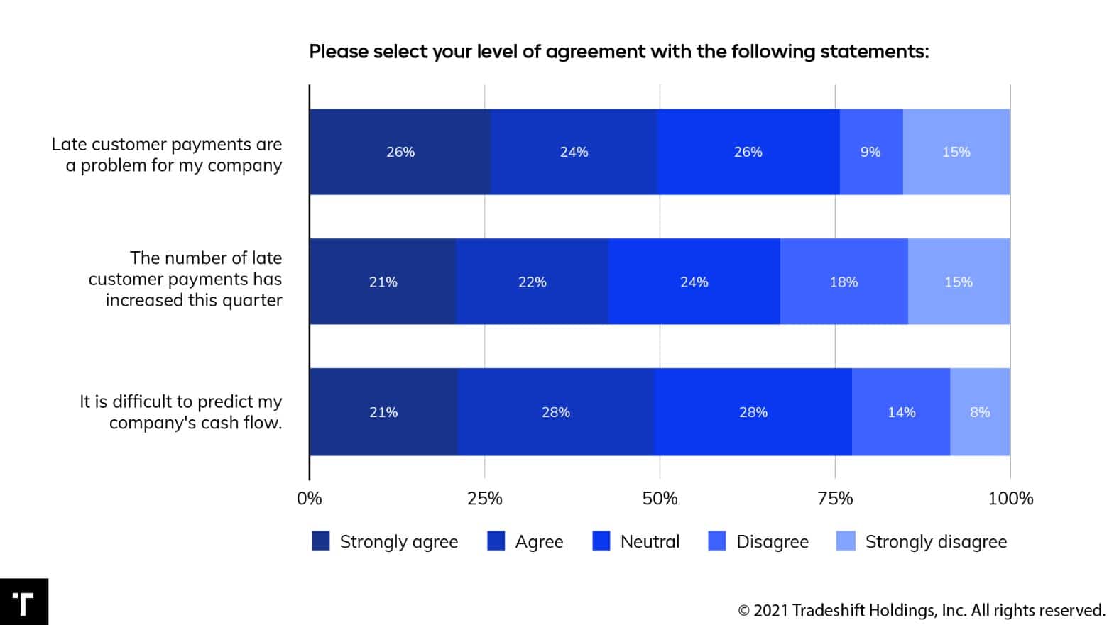 The emerging delta between orders and invoices suggests that working capital is not flowing to suppliers to support the sudden spike in customer demand. In a survey of suppliers, Tradeshift found that nearly a third of respondents reported a deterioration in their cash flow position over the past six months. Almost half indicated that the number of late customer payments has increased since the beginning of the year.