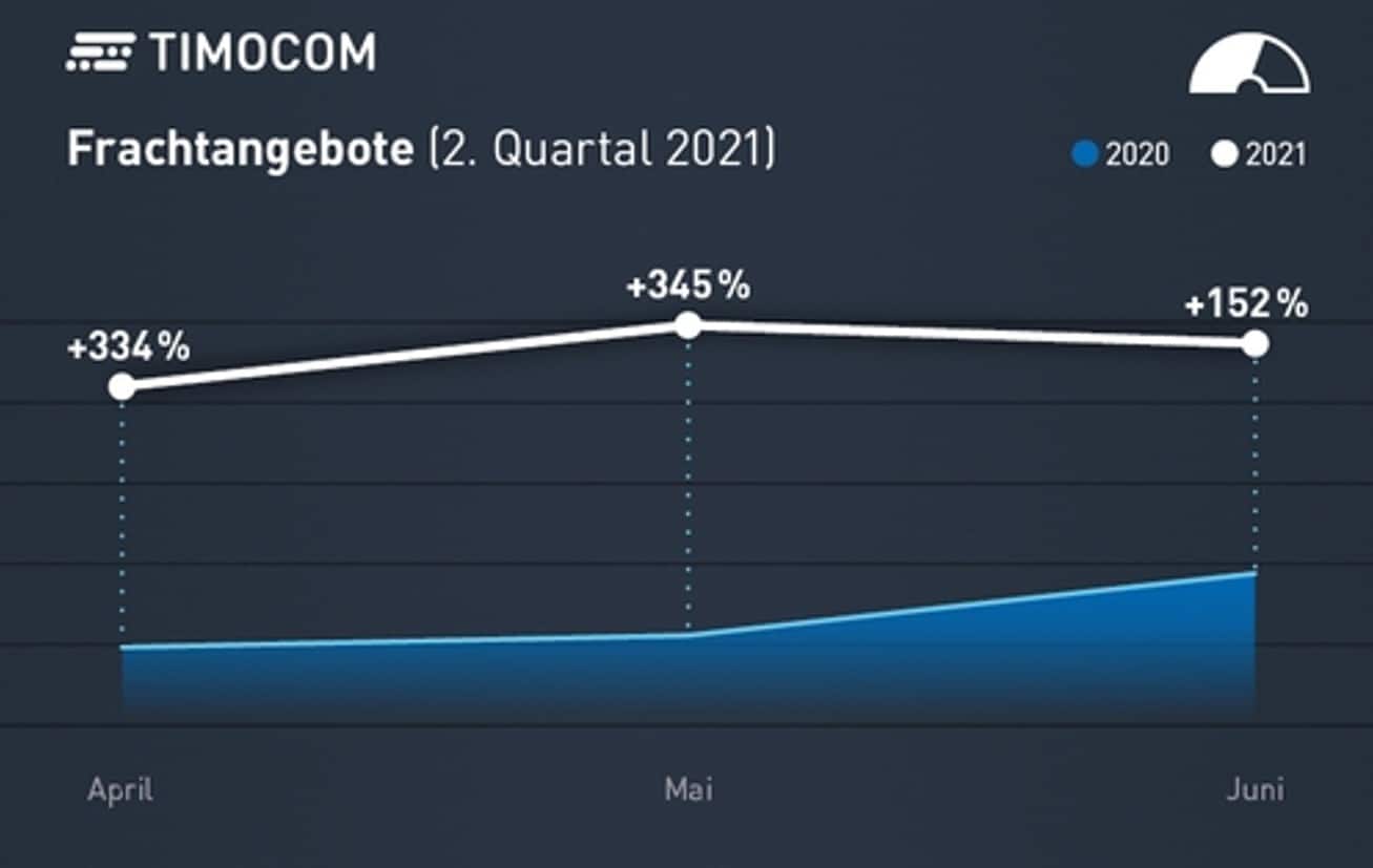 (Erkrath) The second quarter of 2021 continues the developments of the first quarter: The year had already started well in the first quarter with a 58 percent increase in freight offers compared to the same quarter of the previous year 2020. With a further increase in freight inputs of 51 percent compared to the first quarter of 2021, the second quarter sets new record values in the TIMOCOM freight exchange. Compared to the weak second quarter in the Corona year 2020, this means an increase of 251 percent. Compared to 2019, the year before the pandemic broke out, freight numbers have even doubled.