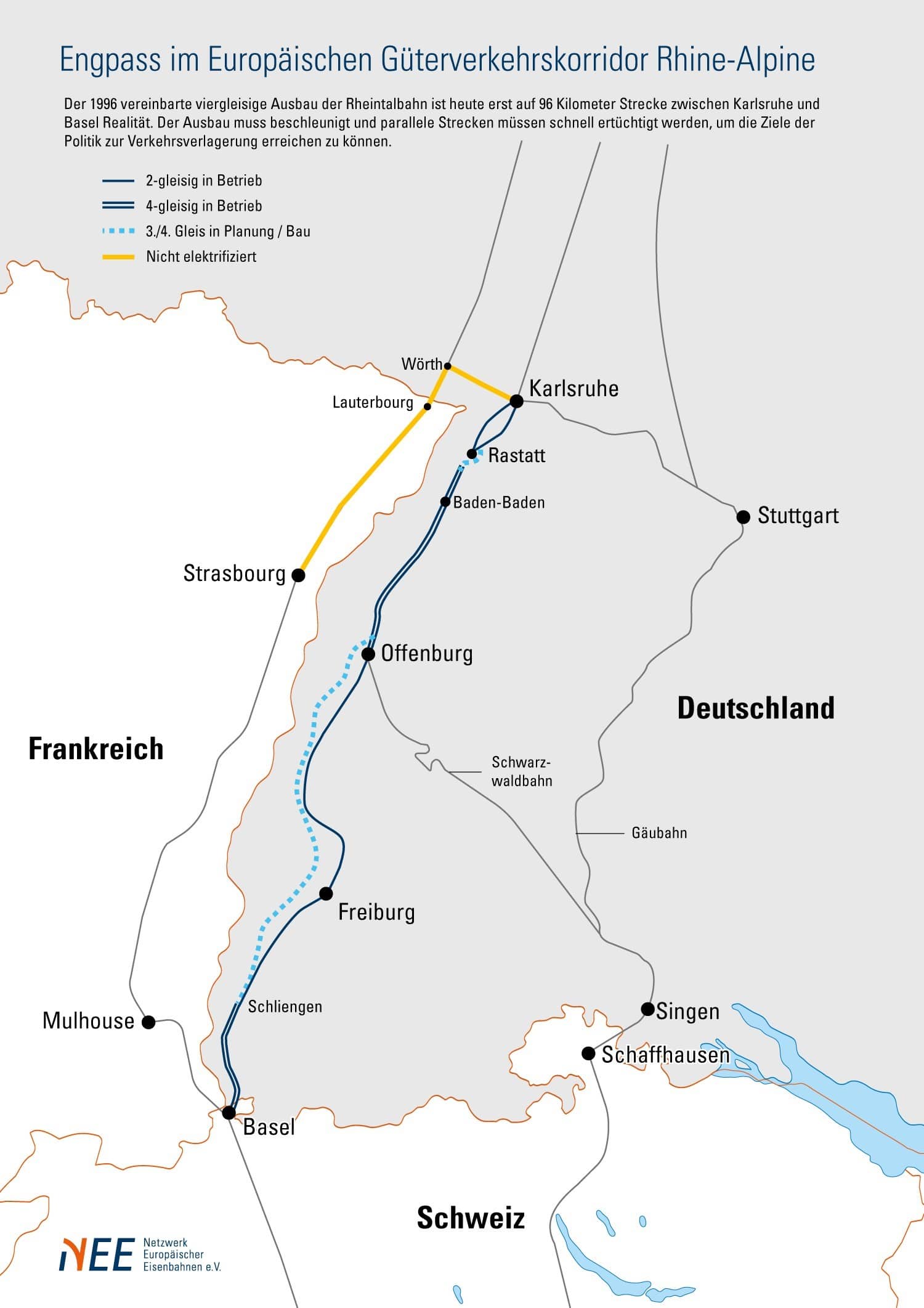 Explanation of the graphic: on the Rhine Valley Railway, the sections Karlsruhe-Rastatt and Offenburg-Schliengen are still not four-track, except for a short section in Freiburg. The route is fully electrified, unlike the diversion route Karlsruhe-Strasbourg-Basel, which is only single-track between Wörth am Rhein and Lauterbourg and is not electrified up to Strasbourg. Due to necessary locomotive changes and unnecessary language barriers among the infrastructure operators, the once significant route today does not even play a relevant role as a diversion route. In the eastern Rhine Valley, the diversion of trains via the Gäubahn is largely only possible on a single track, and infrastructure is also lacking around Singen. As a continuous relief of the Rhine Valley, it is also unusable due to limited capacities on the Swiss side at the Zurich junction.