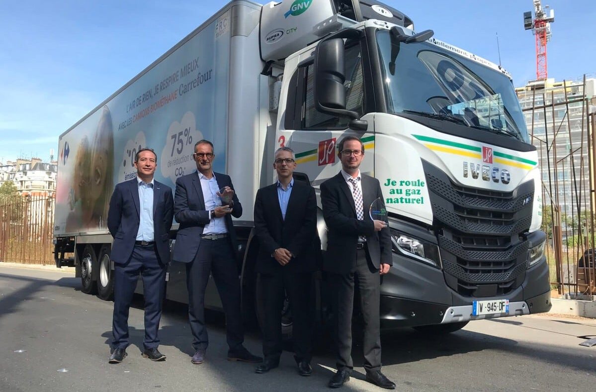 Photo: © Iveco / Image Caption (l. to r.) The 600th biogas truck begins its service at the French retail giant Carrefour. Clément Chandon (Iveco Product Director), Philippe Givone (President and CEO of the freight forwarder Jacky Perrenot), Emilio Portillo (Managing Director of Iveco Trucks France), and Thomas Mathieu (CSR Supply Chain Manager at Carrefour) are pleased about this