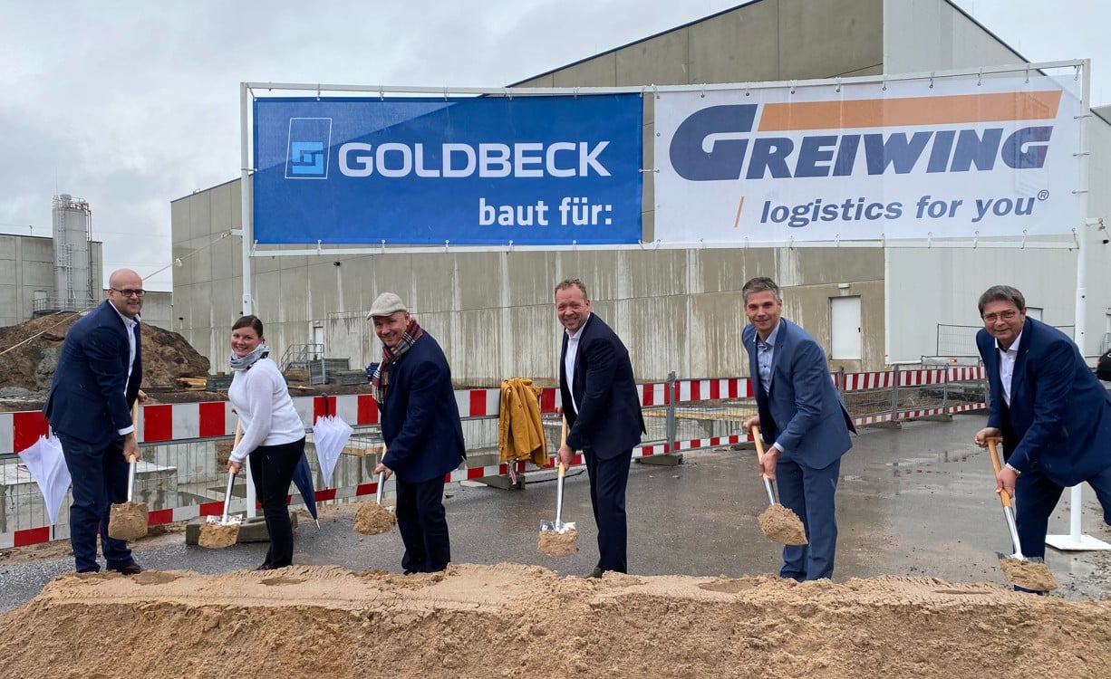 After receiving approval for the construction site, a symbolic groundbreaking ceremony today (November 2) marked the official start of construction. GOLDBECK Münster, as the general contractor, will now build two new logistics halls with areas of 4,000 and 3,150 square meters adjacent to the existing GREIWING branch over the next twelve months. Special attention was paid to sustainability in the planning. Only LEDs will be installed, a photovoltaic system will be set up, and the offices will be heated using an air heat pump. Both halls will be designed for products up to water hazard class 3. In automatic shifting racks, a total of 11,500 pallets can be stored there in the future.