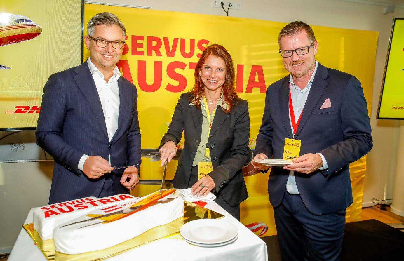 Cake Cutting with Dr. Magnus Brunner, Secretary of State for Aviation; Barbara Achleitner, Managing Director of DHL Air Austria and Ralf Schweighöfer, CEO of DHL Express Austria (© Christian Husar)