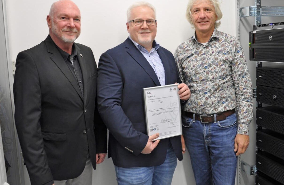 Photo: © GROUP7 / Caption: 27001 project team of GROUP7, from left to right: Klaus Spielmann, Authorized Signatory and Head of the Legal Department, Thomas Wiederspahn, Head of Quality Management, Carsten Cramer, IT Systems Engineer