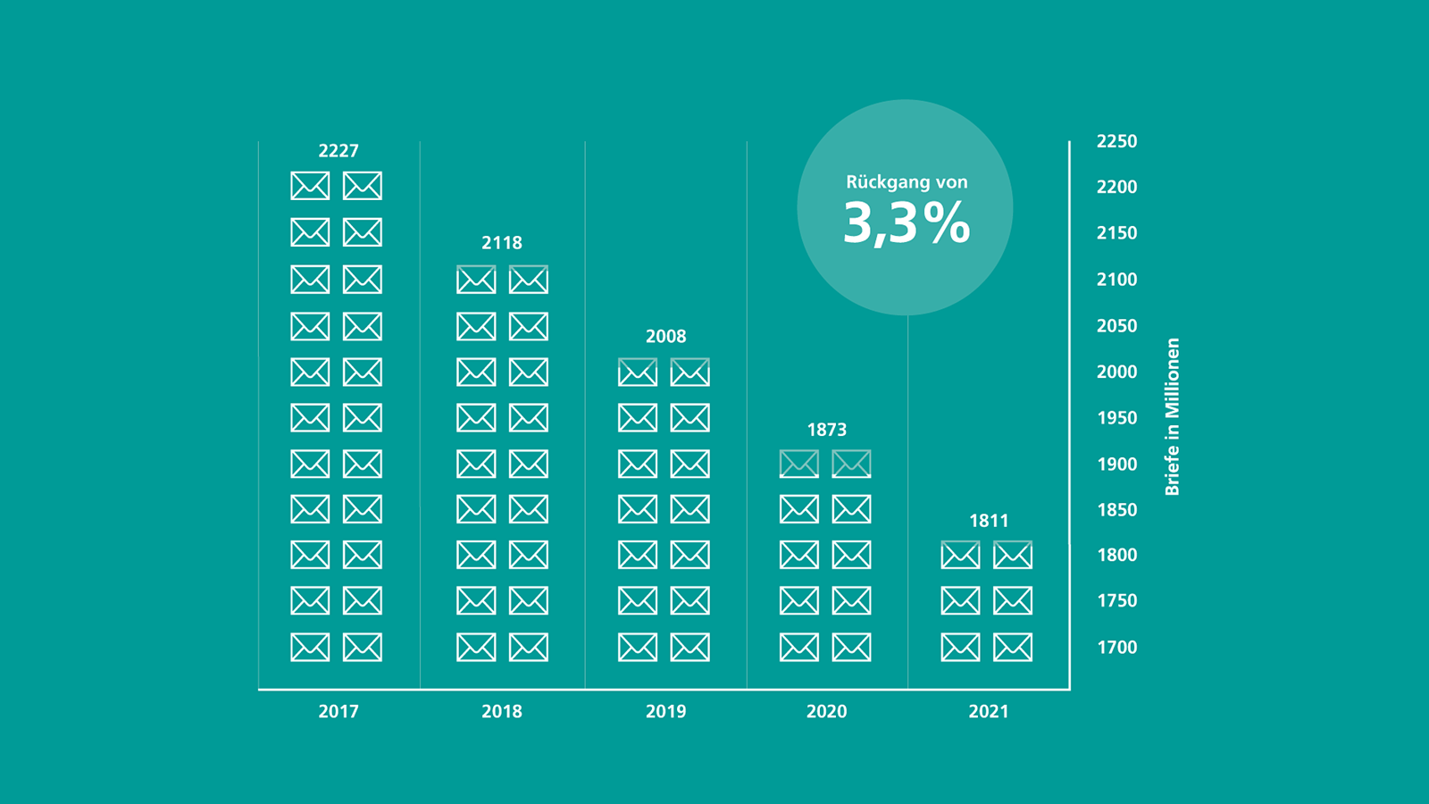 Although the number of letters sent has been declining for years, postal workers processed an impressive 1.811 billion addressed letter shipments in 2021. This is a decrease of 3.3 percent compared to the previous year (2020: 1.873 billion). Over the past 10 years, letter volumes have decreased by about 30 percent overall.