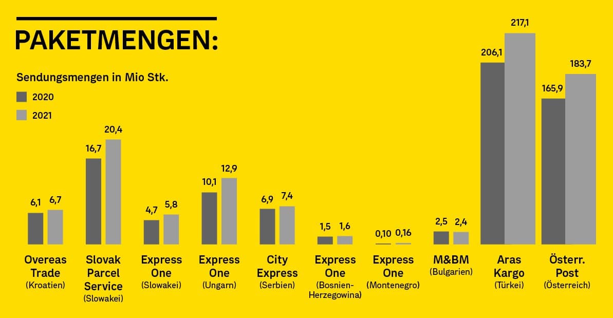(Wien) The Austrian Post transports packages and pallets in a total of nine countries: Bosnia and Herzegovina, Bulgaria, Croatia, Montenegro, Austria, Serbia, Slovakia, Hungary, and Turkey. “Across all subsidiaries, the package volumes in 2021 amounted to 452 million pieces. The majority of these were in Austria and Turkey. However, our subsidiaries in Central and Eastern Europe also recorded enormous growth rates with a volume increase of 16 percent. Last year, we transported nearly 52 million packages there,” said DI Peter Umundum, Board Member for Parcel & Logistics at Austrian Post AG, who emphasizes that the growth in foreign markets, similar to Austria, is primarily due to the increasing trend towards e-commerce.