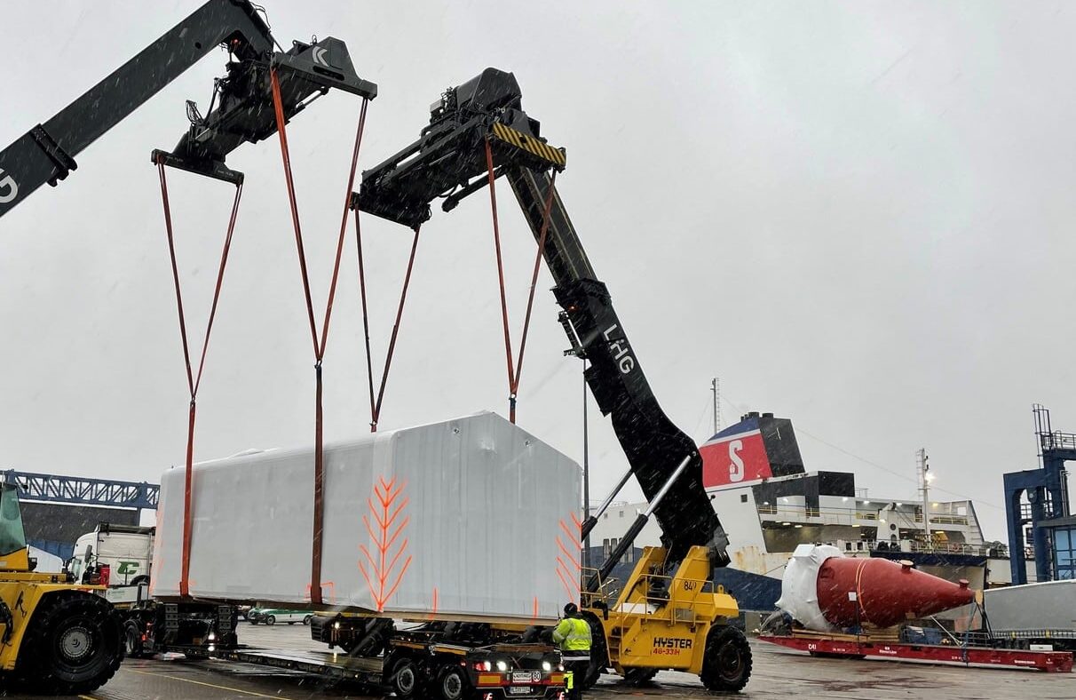 (Lübeck) Loading the ten-meter-long and five-meter-wide modules onto a truck at the Skandinavienkai requires a lot of finesse and teamwork: Two heavy port machines, known as reachstackers, one of which is brand new, are needed for this task. They lift the “Tiny House” from both sides in parallel and place the fourteen-ton load onto a low-loader. The truck then takes over the further transport to the Netherlands.