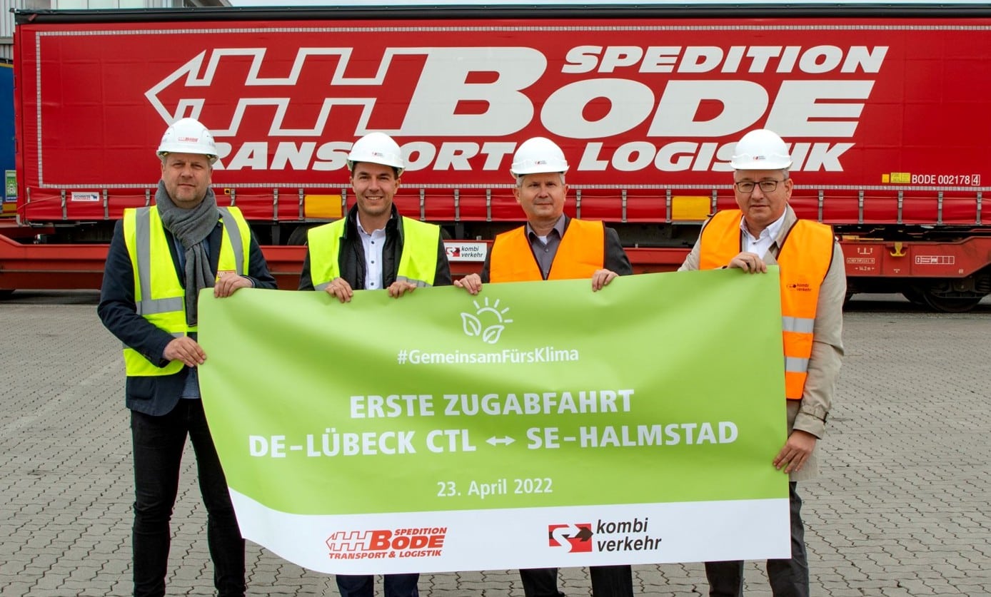 Photo: © Kombiverkehr / Photo Caption: (from left to right) Stev Etzrodt, Managing Director of SBTL Sweden & Finland at the freight forwarder Bode, Marcel Stibany, Team Leader Scandinavian Transport at the freight forwarder Bode, Ulrich Bedacht, Head of Northern European Transport at Kombiverkehr KG, and Alexander Ochs, Managing Director of Kombiverkehr KG, bid farewell to the first train at the Lübeck CTL terminal heading to Halmstad.