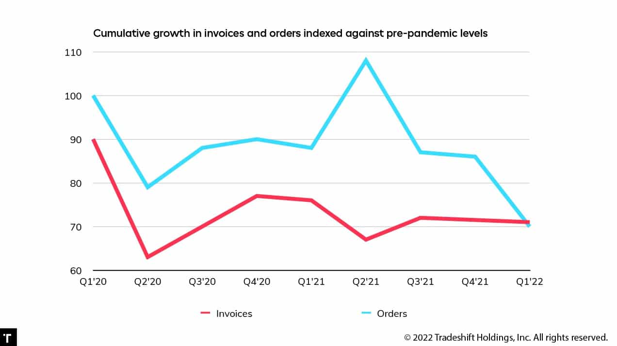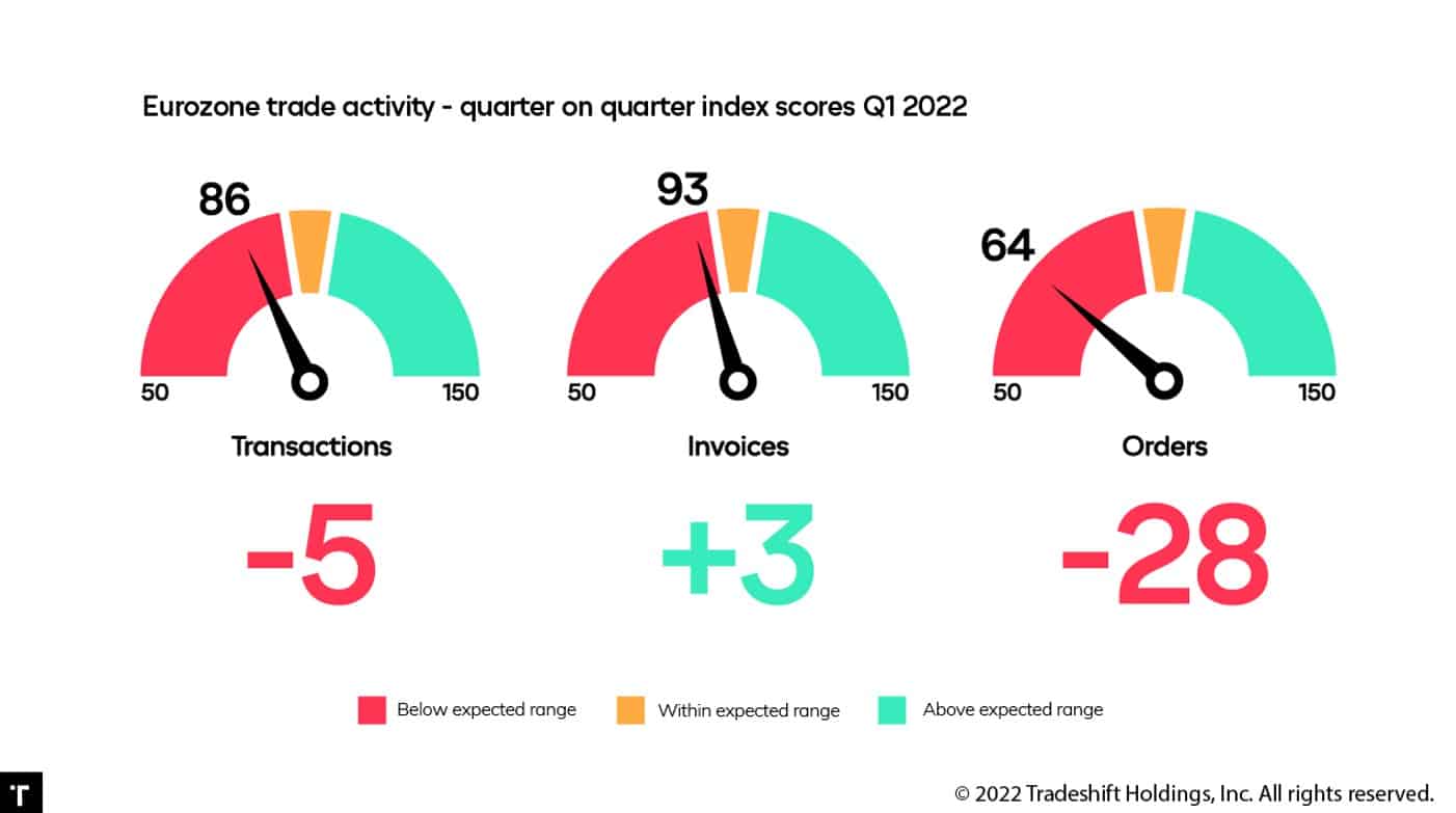 The war in Ukraine and the lockdowns in China have caused global order volumes to plummet in the first three months of 2022, according to new data from Tradeshift. The Q1 2022 Index of Global Trade Health from Tradeshift shows that total transactions (invoices and orders) between buyers and suppliers on the platform fell another 7 points below the forecast range in the first quarter of 2022. Order volumes were particularly affected by a mix of high inflation, longer delivery times, and shortages of key components. Order intake fell by 16 points in the first quarter, marking the steepest loss of momentum since the initial lockdowns in 2020.