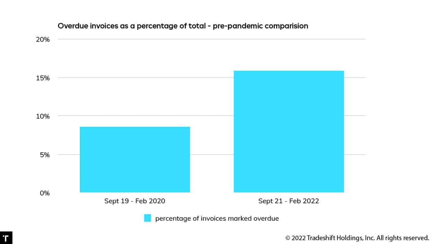 Large companies seem to be bracing for a tough time and are holding back their own cash reserves. This has implications for suppliers, who will come under pressure again in the coming months. Current data from Tradeshift shows that the number of late supplier payments averaged 15.9 percent of the total volume over the last six months, nearly double the rate in the six months prior to the pandemic.