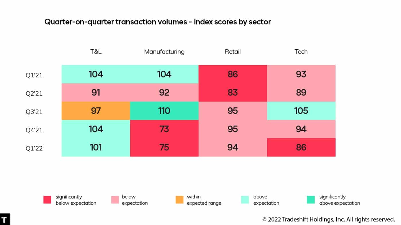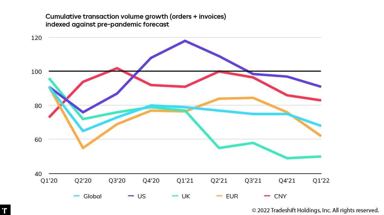 Apr 26, 2022 at 10:31 AMThe geopolitical tensions and renewed lockdowns in China pose significant challenges for logistics companies. Tradeshift data shows that the transaction volume across the transport and logistics industry remains higher than expected, indicating fierce competition for limited capacities.