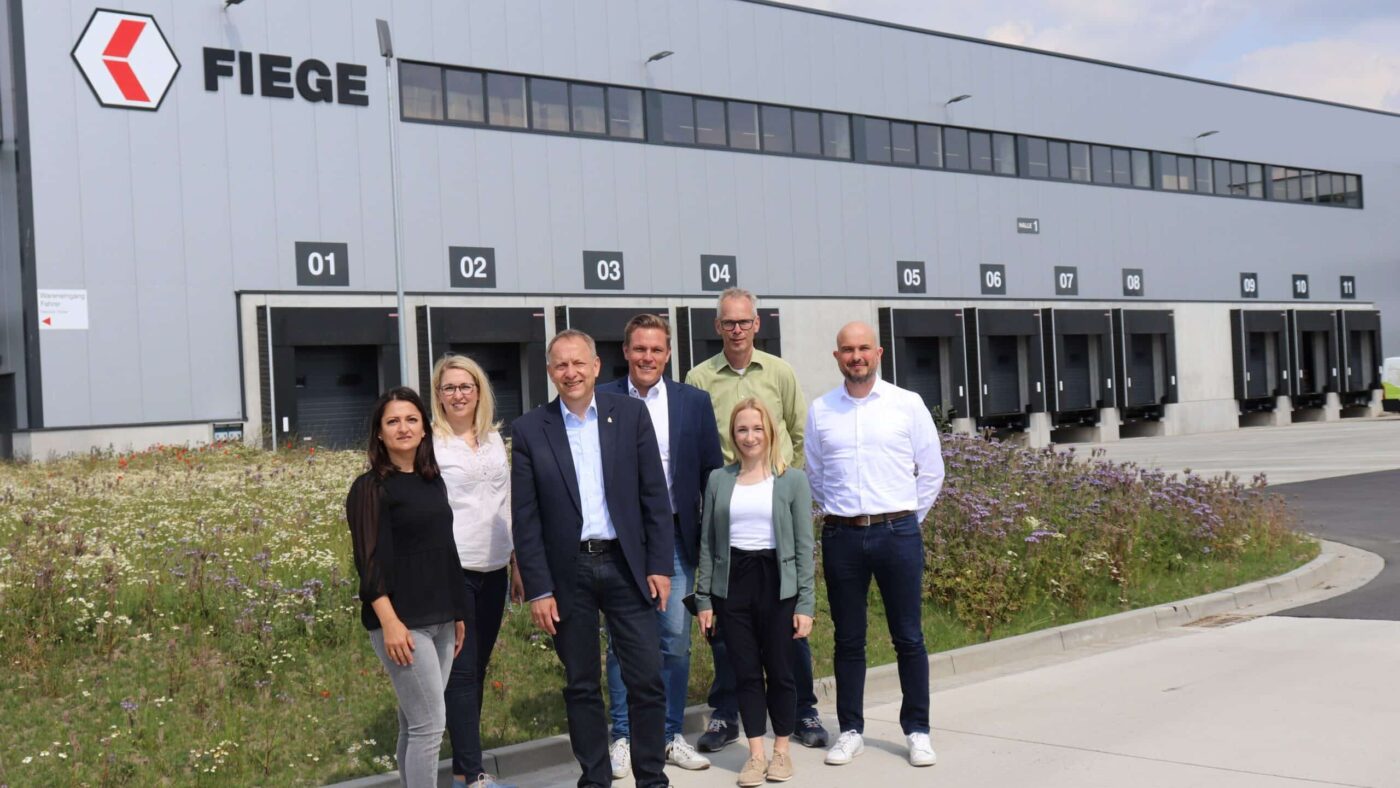 Photo: © Fiege / Image caption: (from left to right): Saha Onal-Elmas, Maria Ruß (both Economic Development Peine), Klaus Saemann (Mayor of the City of Peine), Christoph Kulm, Lutz Rissmann (both Fiege Peine), Birgit Wilde and Thomas Trotnow (both Fiege Real Estate)