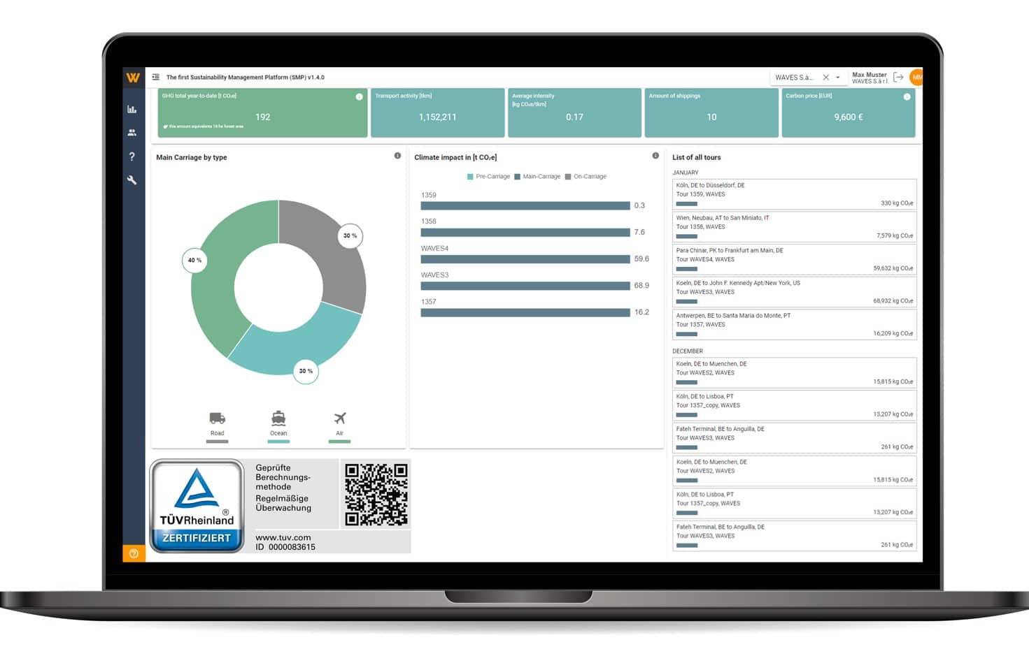 (Luxembourg) Ensuring transparency and enabling more sustainability – this is the goal of the Sustainability Management Platform (SMP). WAVES customers who actively use the modular cloud platform for corporate sustainability management appreciate the high data quality, precise calculations, and detailed evaluations. They benefit from the convenient data upload as well as the clear, intuitively understandable dashboards. To provide even more security to customers and partners, WAVES has now had the SMP modules Sustainable Tendering – for shippers – and Sustainable Transport – for carriers – certified by an independent and neutral institution.