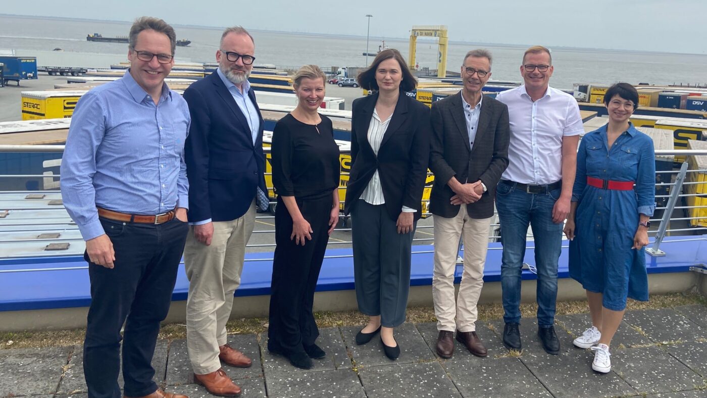 Photo: © HWG / Image caption (l. to r.): Arne Ehlers (HWG), Philipp Rademann (HWG), Alexandra Brandt (Niedersachsen Ports), Claudia Müller (MP), Peter Zint (HWG), Knut Kokkelink (Niedersachsen Ports), Verena Hedtke (personal assistant to Ms. Müller).