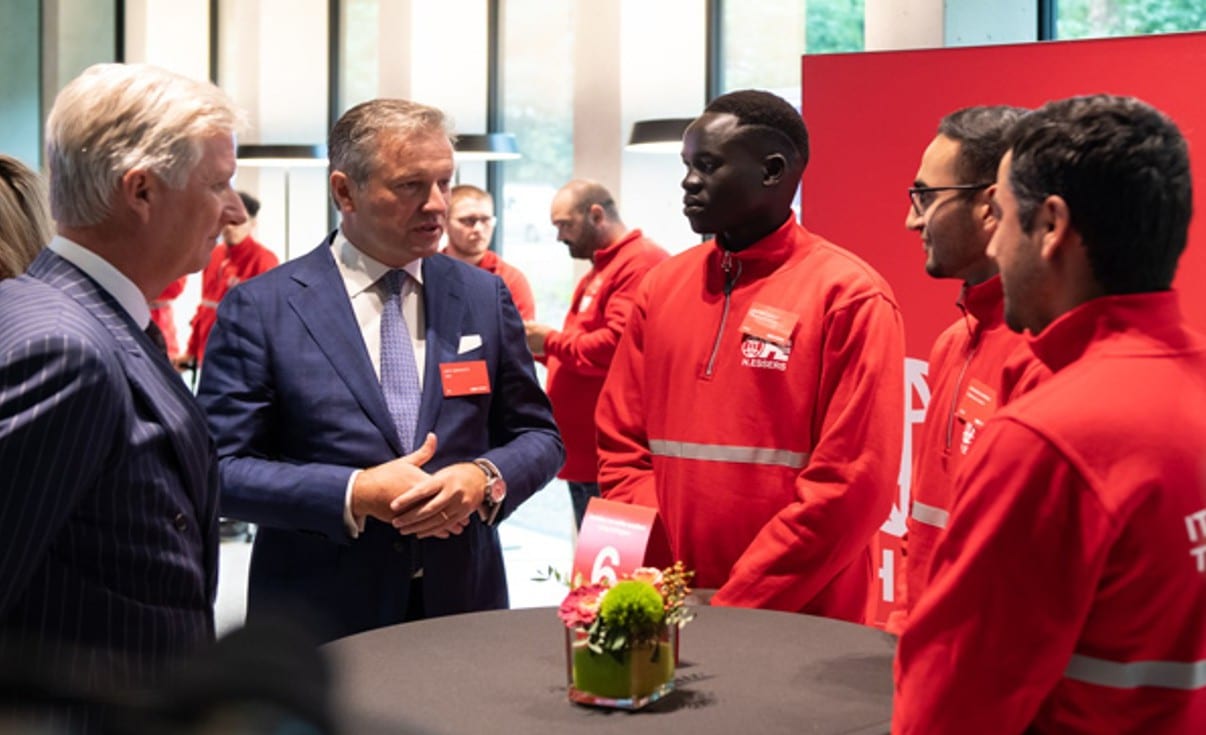 Belgian King Philippe (left) and Gert Bervoets, CEO of H. Essers (2nd from left), in conversation with Essers employees