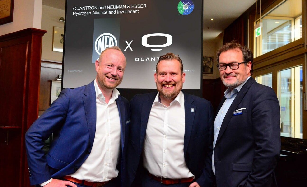 Photo: © Quantron / Image Caption: NEA Group MD Jens Wulff & Quantron AG board members Andreas Haller & Michael Perschke announce investment and collaboration