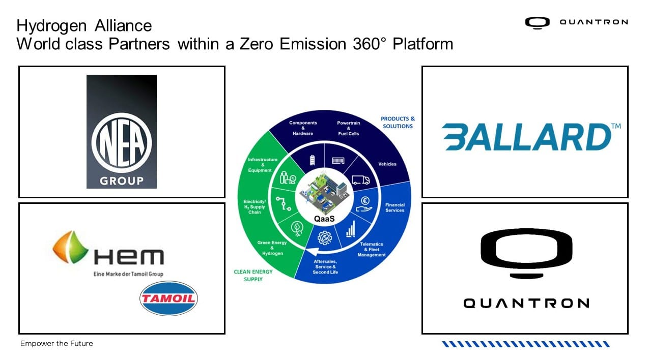 As an important partner of the Hydrogen Alliance, Deutsche Tamoil / HEM has joined as the first gas station operator and will work with QUANTRON to examine the feasibility of H2 filling stations along its more than 400 HEM gas stations in Germany. These are to be upgraded in a staggered process with H2 refueling options, with a focus also on refueling heavy-duty vehicles of QUANTRON’s customers.