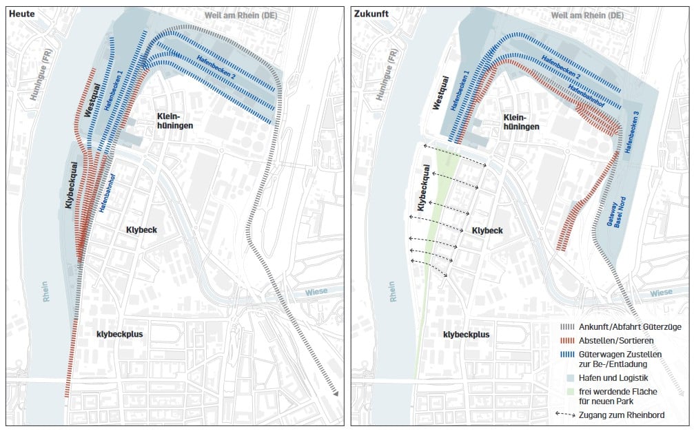 Feb 2, 2023 at 6:09 PMAt Klybeckquai and Westquai, the Canton of Basel-Stadt has a unique opportunity to develop a large area comprehensively. The relocation of the current harbor railway at Altrheinweg is a prerequisite for this area development. The government council has decided to present the “South Quay” option for the relocation of the harbor railway to the Grand Council. The harbor railway will now be located in the core harbor area, and the existing tracks south of the Wiese will be removed.
