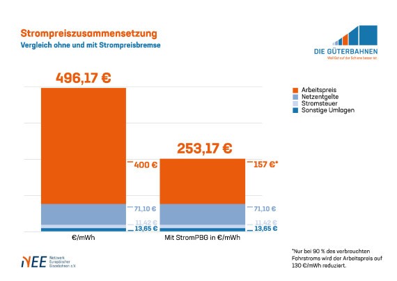 The significant additional costs that have arisen for freight railways since the beginning of the energy crisis have therefore not been eliminated by the electricity price brake: The same megawatt-hour of electricity would have cost around 160 euros in 2021, including network charges, taxes, and levies, only about 63 percent of today’s relieved price.