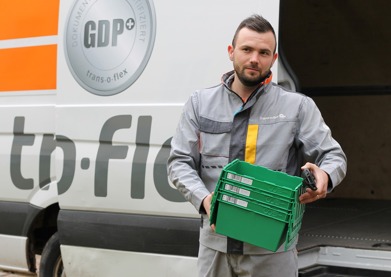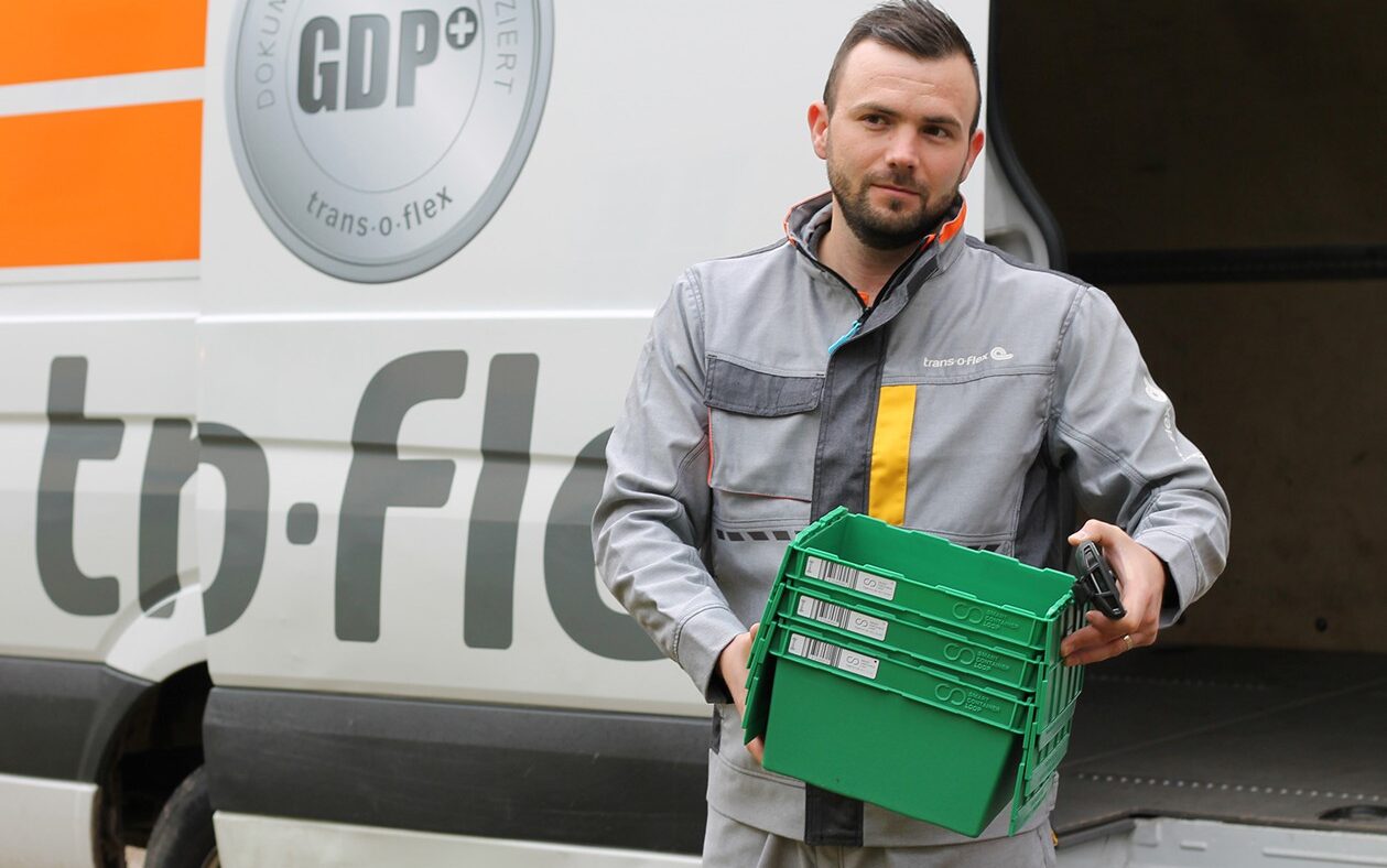 Ideally, the reusable boxes are used for regularly supplied recipients. After delivery, the further process is as follows: During the next delivery, the trans-o-flex driver takes the empty boxes back and drops them off at the trans-o-flex location when picking up new goods. At the trans-o-flex location, the boxes are stacked on pallets and then transported bundled for cleaning. They are then sent for the next shipment to the respective customer or their warehouse service provider.
