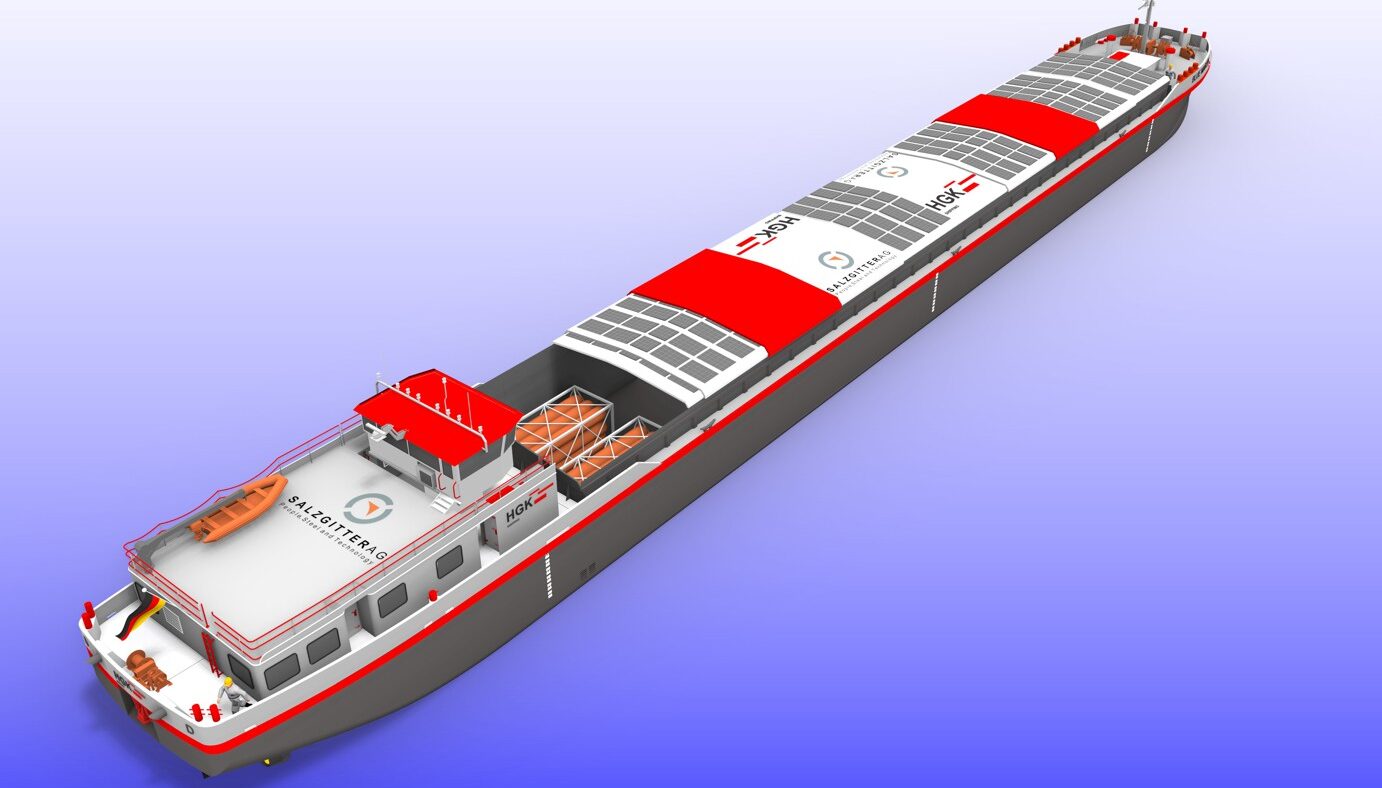 The design of the dry cargo ship for the steel supply chain has been developed and completed by the team at the HGK Shipping Design Center. Powered by a diesel-electric drive, the ship is again designed to be retrofitted with future-oriented drive systems and fuel types. This includes the option to install a void space in the midship section in the future. Additionally, solar panels will be installed on the hatch covers to generate climate-neutral electrical energy, which will not only be fed into the onboard power grid but also integrated into the drive train for the first time. In its dimensions, design, and cargo space layout, the cargo motor vessel is explicitly tailored to the needs of Salzgitter AG. With a length and width of 86 x 9.5 meters, the canal-compatible ship has a carrying capacity of 1,535 tons. It is intended to be used in the shuttle service between the Salzgitter locations and customers in the Netherlands and Belgium to transport steel input and output products such as steel scrap.