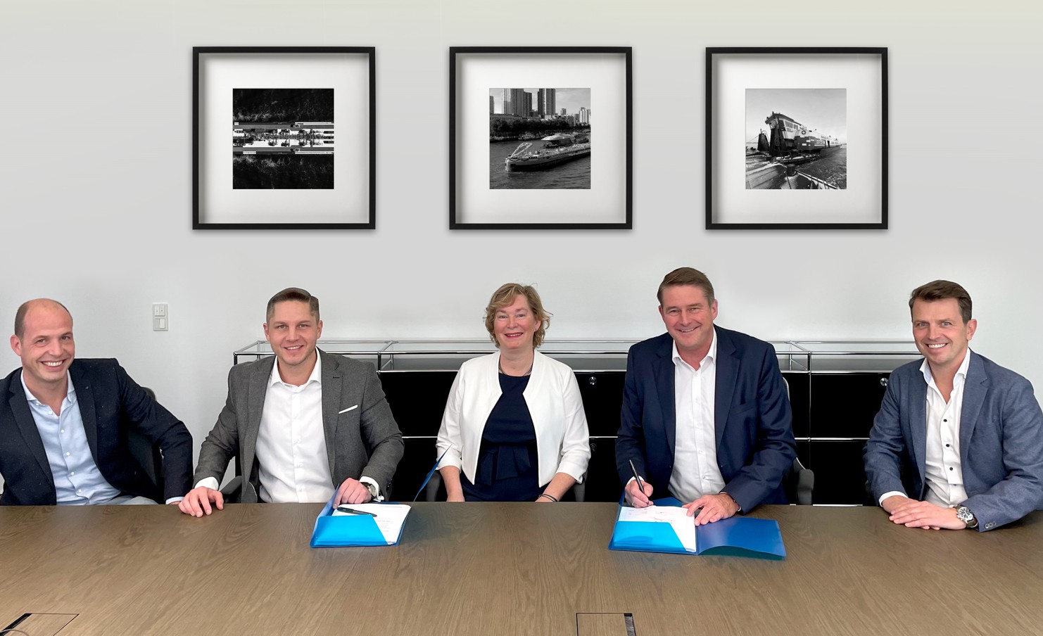 Pictured (l. to r.): Marcel van Tiem, Project Manager, De Gerlien van Tiem bv, Florian Bleikamp, Head of Chartering Canal / Rhine, HGK Dry Shipping GmbH, Marijke van Tiem, Director, De Gerlien van Tiem bv, Andreas Lemme, Managing Director, HGK Dry Shipping GmbH, Eric Rietveld, Project Manager, De Gerlien van Tiem bv