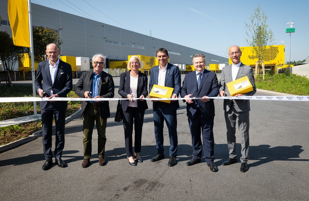 Photo: © Austrian Post / Image caption: Official opening act with Walter Oblin, Deputy General Director, Board for Mail & Finance, Austrian Post AG, Georg Pölzl, General Director, Austrian Post AG, Elisabeth Stadler, Chairwoman of the Supervisory Board, Austrian Post AG, Peter Umundum, Board Director for Parcel & Logistics, Austrian Post AG, Michael Ludwig, Mayor of the City of Vienna, and Toni Faber, Cathedral Priest of Vienna