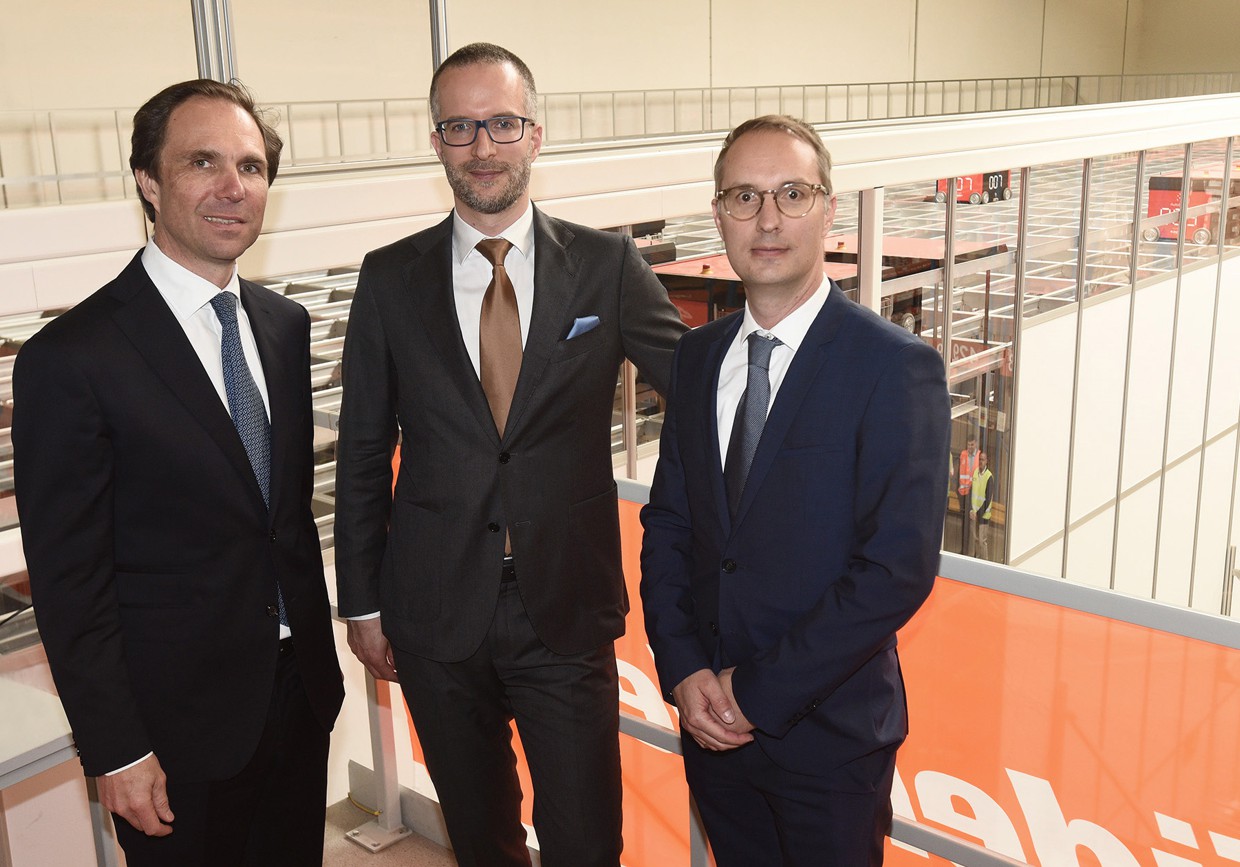 In front of the new automated warehouse (from left): Wolfram Senger-Weiss, Chairman of the Management Board, Balint Varga, Country Manager Hungary, and Thomas Schauer, Regional Manager Central and Southeastern Europe (all Gebrüder Weiss)