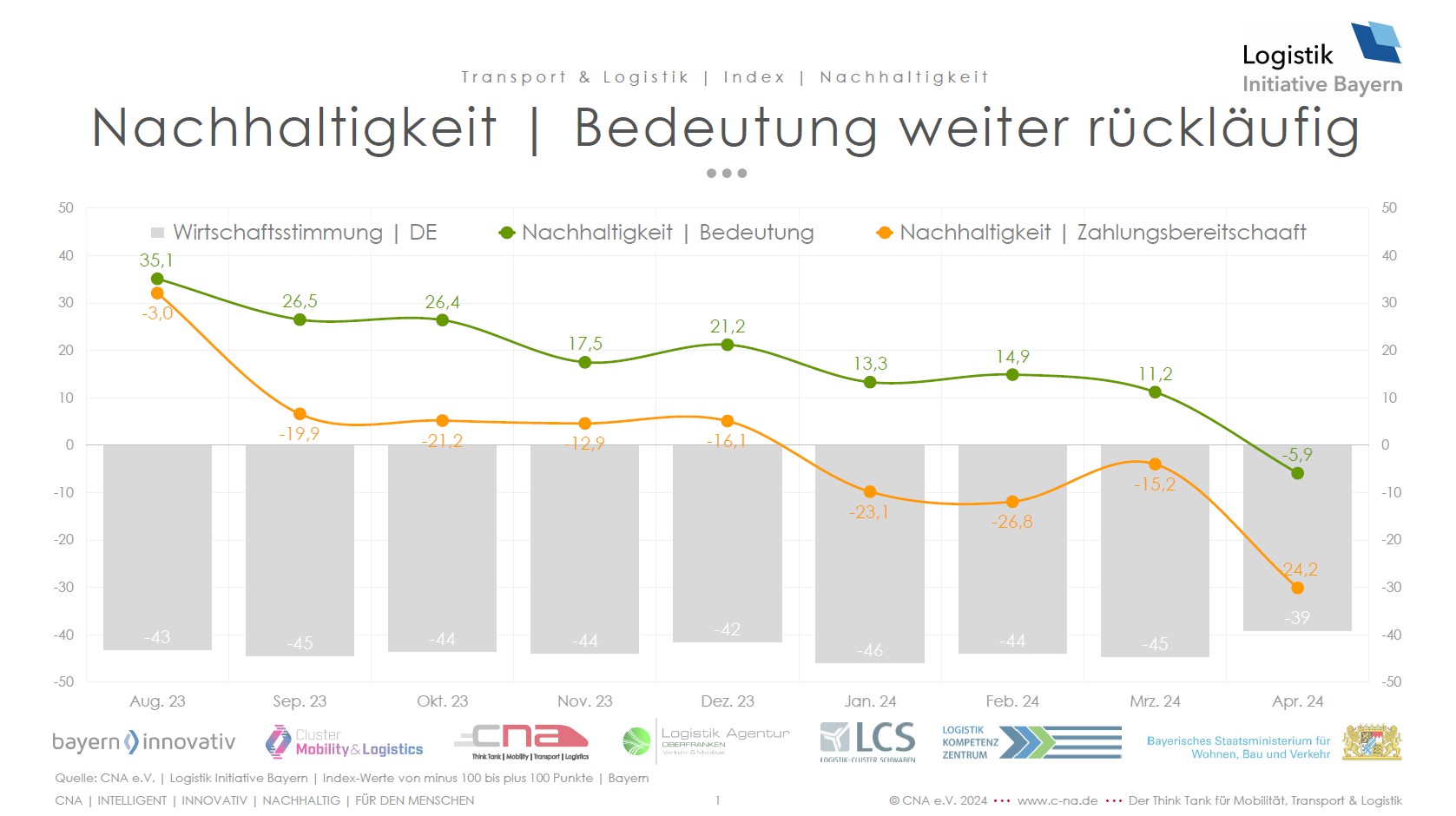 May 30, 2024 at 5:02 PMThe May edition of the Index | Sustainability | Transport + Logistics | Bavaria notes a further decline in the importance of sustainability for the transport and logistics industry. One reason is still the high energy and fuel costs, which push other priorities into the background.