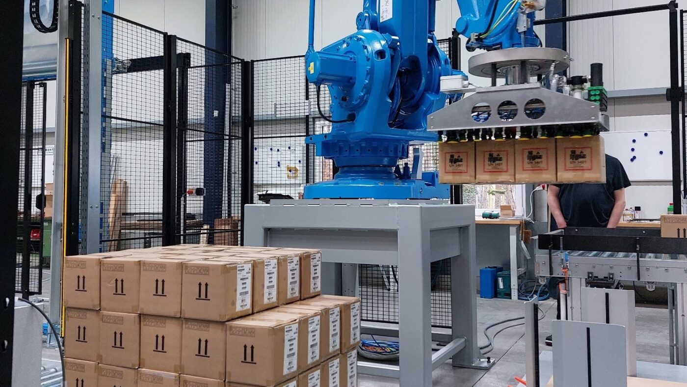 The new robotic solution in Venlo was planned and tested by a team from operations, engineering, project management, and IT development. The palletizing robot, supplied by automation specialist Segbert, can grasp multiple boxes simultaneously with its vacuum gripper and process between 700 and 3,000 boxes per hour, depending on size. Karoline Kowalik: “What makes Bucky special is that it is a turnkey solution that integrates various process steps.” Thus, Bucky palletizes the boxes from loosely loaded containers in the inbound process, simultaneously captures the serial numbers, and assigns them to a pallet. Once the pallet is completely assembled according to a specified pattern, it is transported to the packaging machine, wrapped in film, and labeled with a pallet number – all automatically.