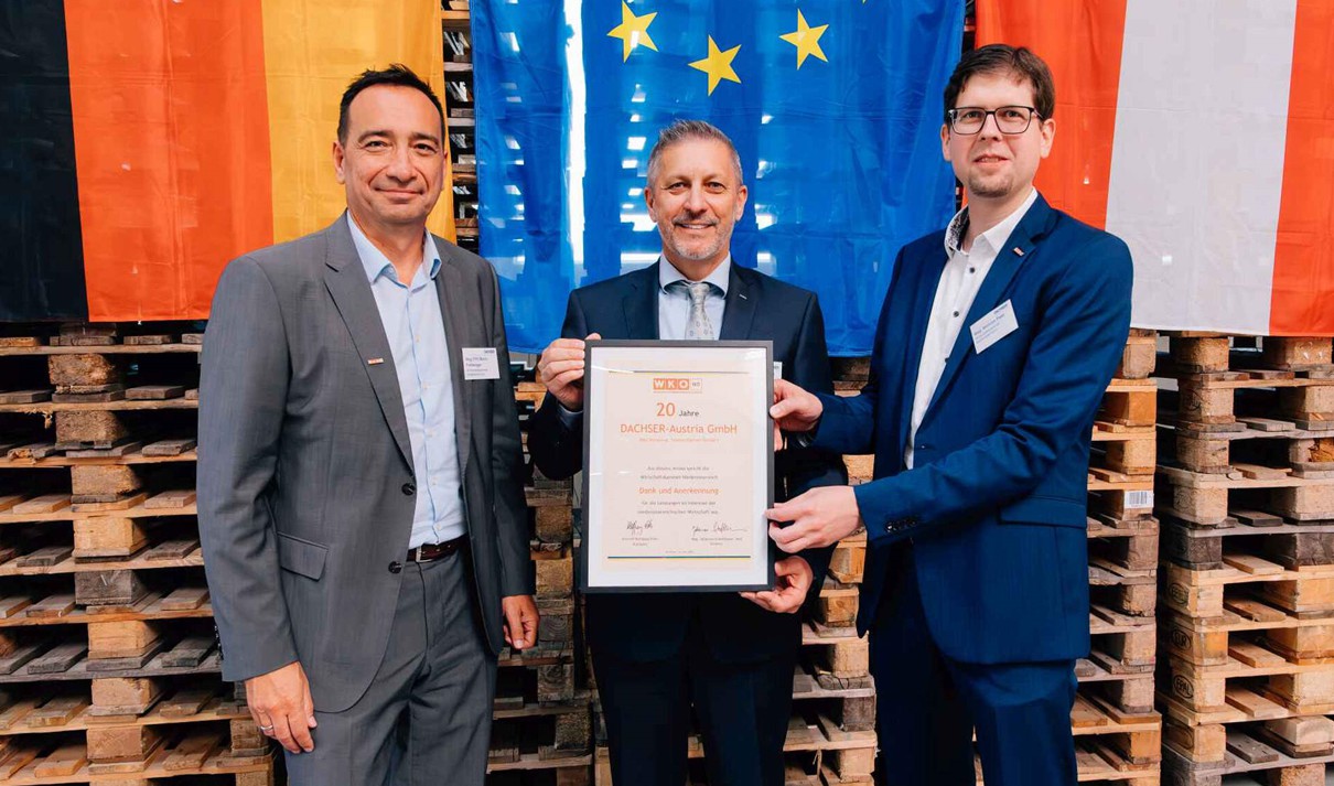 Title photo: © Dachser / Caption (l. to r.): Mario Freiberger M.A. (Magister FH), Head of the Schwechat branch of the Chamber of Commerce Lower Austria, (left) and Mathias Past M.A. (Magister), Chairman of the Schwechat branch of the Chamber of Commerce Lower Austria, (right) presented Günter Hirschbeck, Managing Director European Logistics Austria, with a certificate on the occasion of the 20th anniversary of DACHSER Austria