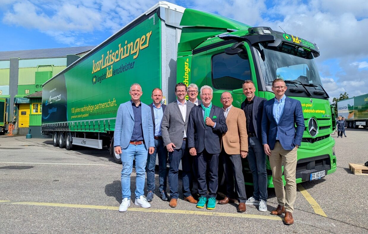 Photo: © Mercedes-Benz / Image caption: Joint efforts for the drive transition (l. to r.): Oliver Berger, Manager Transport Network at Daimler Truck, Jürgen Distl, Head of Operations Mercedes-Benz Trucks, Karlkristian Dischinger, Managing Director at karldischinger logistics service provider, Volker Speck, COO Economic Area Southern Baden at Kestenholz Group, Karlhubert Dischinger, partner at karldischinger logistics service provider, Stephan Kestenholz, Chairman of the Board at Kestenholz Automotive Holding, Christian Wilz, Chairman of the Management Board Mercedes-Benz Trucks & FUSO Germany, and Thomas Kestenholz, CEO of Kestenholz Group. The Kestenholz Group is a partner and dealer of Mercedes-Benz Trucks.