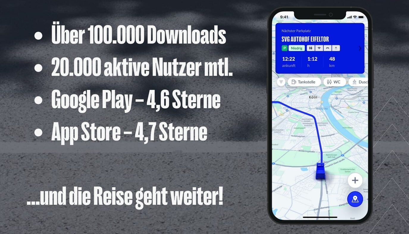 (Cologne) With the LKW.APP, Aparkado has revolutionized the search for parking spaces for truck drivers. Asignificant milestone is the specially developed occupancy system, which displays the occupancy of over 40,000 truck parking spaces in real-time and significantly facilitates route planning for drivers and logistics companies.The numbers speak for themselves: More than 100,000 downloads, 20,000 active users per month, and excellent ratings of 4.6 stars on Google Play as well as 4.7 stars in the App Store underline the added value of the app for the transport industry.