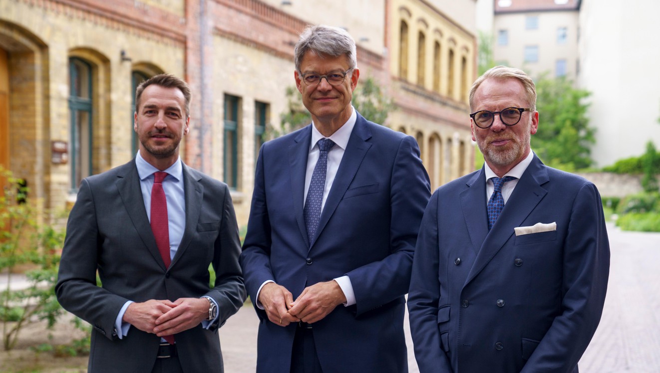 Efforts for the modernization of the waterway system (from left to right): Steffen Bauer, CEO of HGK Shipping, Dr. Patrick Schnieder, Federal Minister for Transport, and Eric Oehlmann, head of the Directorate-General for Waterways and Shipping © Stella Scheibenzuber | HGK Shipping