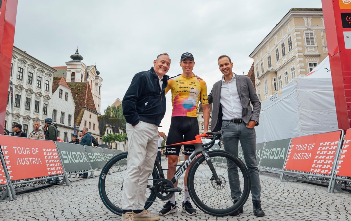 Photo: © Gebrüder Weiss/Raphael Sturm / Image caption (l. to r.): Klaus Bannwarth (Branch Manager Gebrüder Weiss Wels), Kilian Feurstein (Professional Cyclist from Team Vorarlberg), and Karl-Heinz Raab (Sales Manager Gebrüder Weiss Wels)