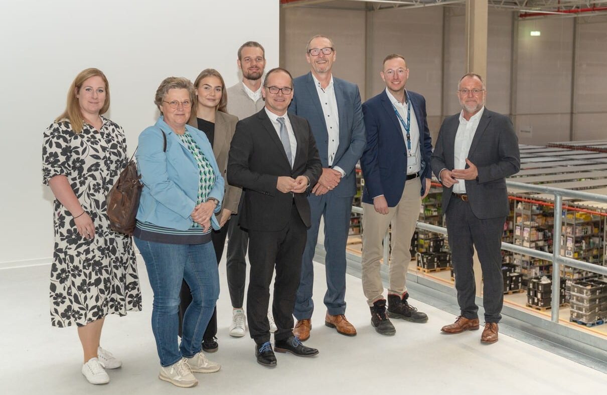 Photo: © ID Logistics / Caption (l. to r.): On the intermediate stage with a view into the hall: Svea Halfmann (Deputy Mayor of the Municipality of Estorf), Sandra Wiechmann (First Samtgemeinderätin), Anna Probst (New Business Manager at thirteen seven), Dennis Heineking (Managing Director of Heineking), Grant Hendrik Tonne (Member of the State Parliament and Minister of Economics of Lower Saxony), Jürgen Diehl (Managing Director of BGO), Leif Venus (Site Manager of ID Logistics in Estorf) and Detlev Kohlmeier, District Administrator of the Nienburg/Weser District