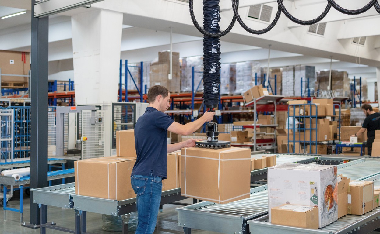 Since then, the quickLIFT has been supporting employees daily in lifting, moving, and lowering boxes weighing up to 32 kilograms, as this is the maximum weight accepted by the transport service providers. Lighter packages are still handled by employees themselves, while heavy or unwieldy shipments are conveniently moved with the vacuum lifter. “We use the system hundreds of times a day. The shipping department has thus become significantly more attractive,” reports Büter.