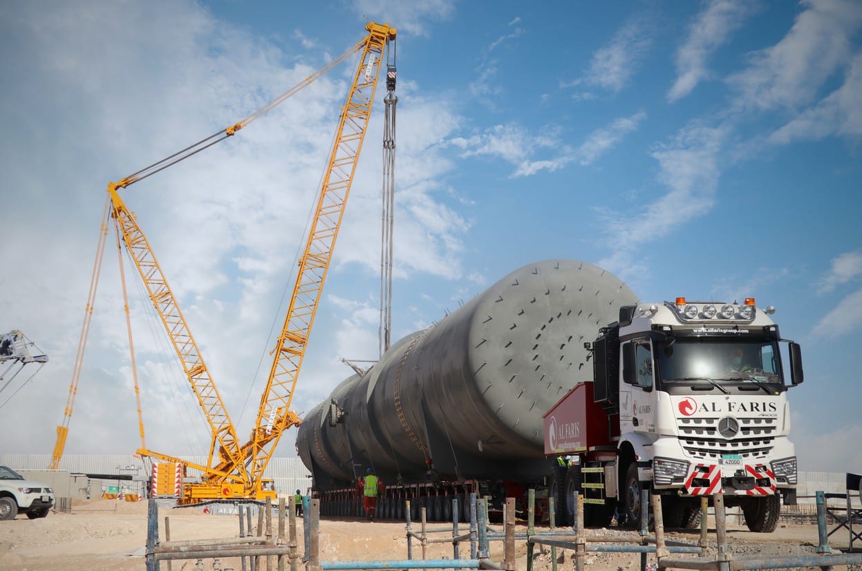 Im Anschluss an den Transport haben die Tanks noch etwa 100 Meter am Haken eines 400 Tonnen Raupenkrans zurückgelegt, um dann auf den vorbereiteten Fundamenten montiert zu werden. Auch Dean Exner, Goldhofer Gebietsverkaufsleiter Middle East zeigte sich hinsichtlich dieses Megaprojektes seines Kunden AL Faris hoch erfreut. „Wenn es darum geht, schwerste und voluminöse Frachten auf und abseits der Straße an ihr Ziel zu bringen, dann sind die THP/SL-Module oft die wirtschaftlichste Lösung. Sie erlauben es, eine enorme Nutzlast mit ausdauernden Einsatzzeiten zu kombinieren“, so Dean Exner.