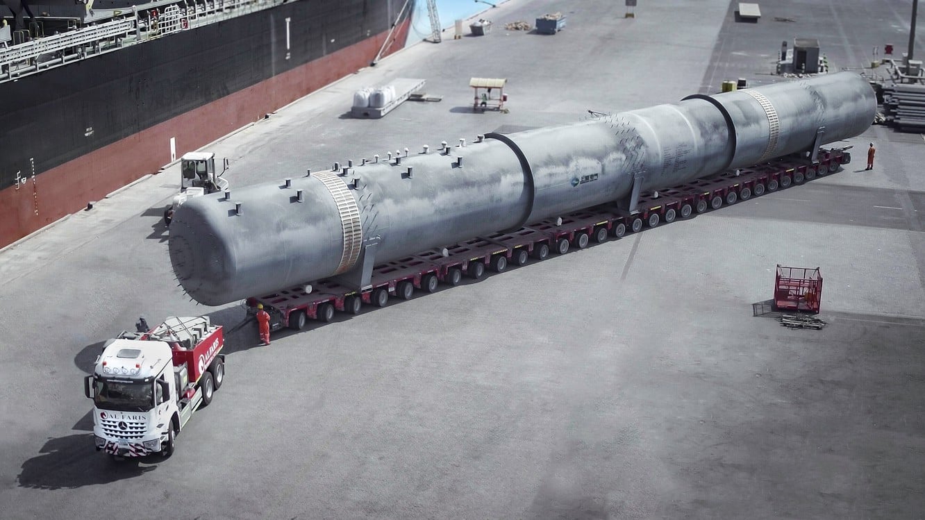04.08.2021 um 14:44 UhrFür die Beförderung und den Aufbau von 30 Tanks für den weltweit größten Solarpark in Dubai wurde das erfahrene Logistik- und Schwertransportunternehmen AL Faris beauftragt. Um den Transport vom Jebel Ali Port (VAE) zum Mohammed-Bin-Rashid-Al-Maktoum-Solar-Park durchzuführen, vertraut das Unternehmen für den Einsatz erneut seinen bewährten Goldhofer-Schwerlastmodulen.