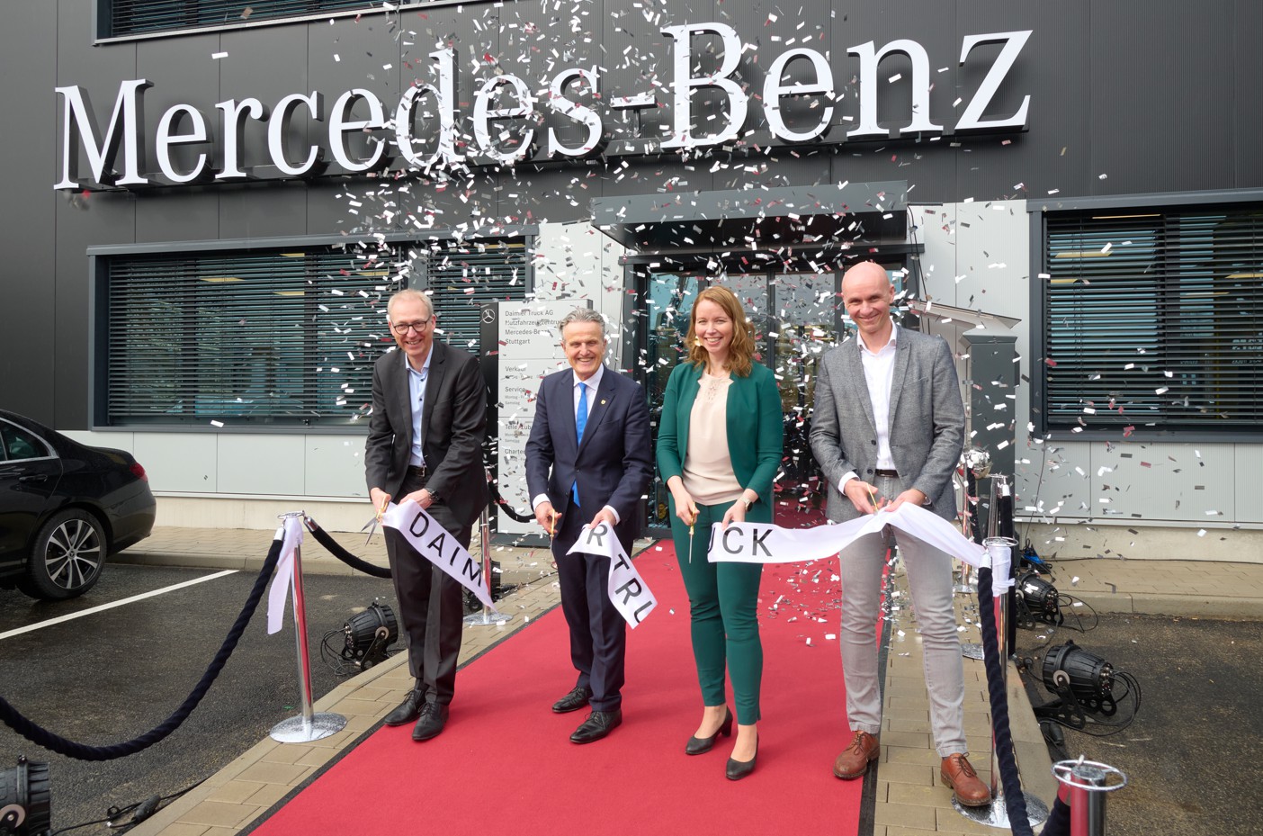 Foto: © Daimler Truck / Bildlegende (v.l.n.r.): Volker Hüntrup, Leiter Own Retail Mercedes-Benz Trucks Europe, Frank Nopper, Oberbürgermeister der Landeshauptstadt Stuttgart, Stina Fagerman, Leiterin Marketing, Vertrieb und Services Mercedes-Benz Trucks und Mark Pleß, Center- & Verkaufsleiter Mercedes-Benz Trucks Stuttgart & Reutlingen, bei der Eröffnung des neuen Standorts für Vertrieb und Service von Lkw und Bussen in Stuttgart