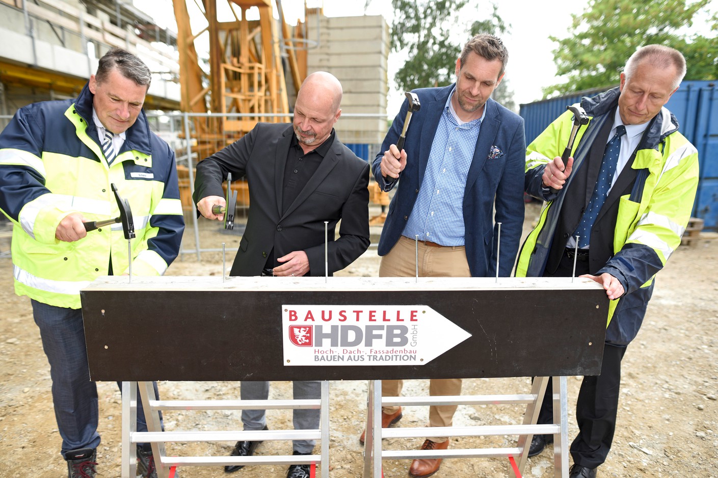 Fotos: © Rostock Port / : Legende Titelbild (v.l.n.r.): Jens A. Scharner, ROSTOCK PORT-Geschäftsführer, Dr. Chris von Wrycz Rekowski, erster Stellvertreter der Oberbürgermeisterin, Markus Kutz, projektleitender Architekt von den Buttler Architekten und Dr. Gernot Tesch, ROSTOCK PORT-Geschäftsführer, hämmern die Zimmermannsnägel in den Richtbock