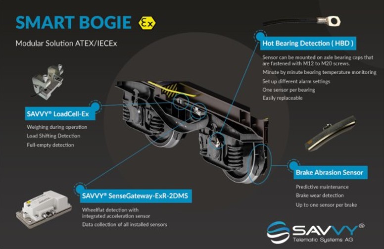 Der intelligente, digitale Informant «Smart Bogie» sorgt im Schienenverkehr für mehr Sicherheit. Direkt am Drehgestell des Güterwagens angebracht, sammelt die Technologie über verschiedene Messsensoren aussagekräftige Informationen und ermöglicht so eine Echtzeitüberwachung allfälliger Anomalien. Bei Bedarf leitet das integrierte System von SAVVY® Handlungsempfehlungen ab, sodass Defekte am Wagen behoben und folgenschwere Unfälle wie Zugentgleisungen verhindert werden können.