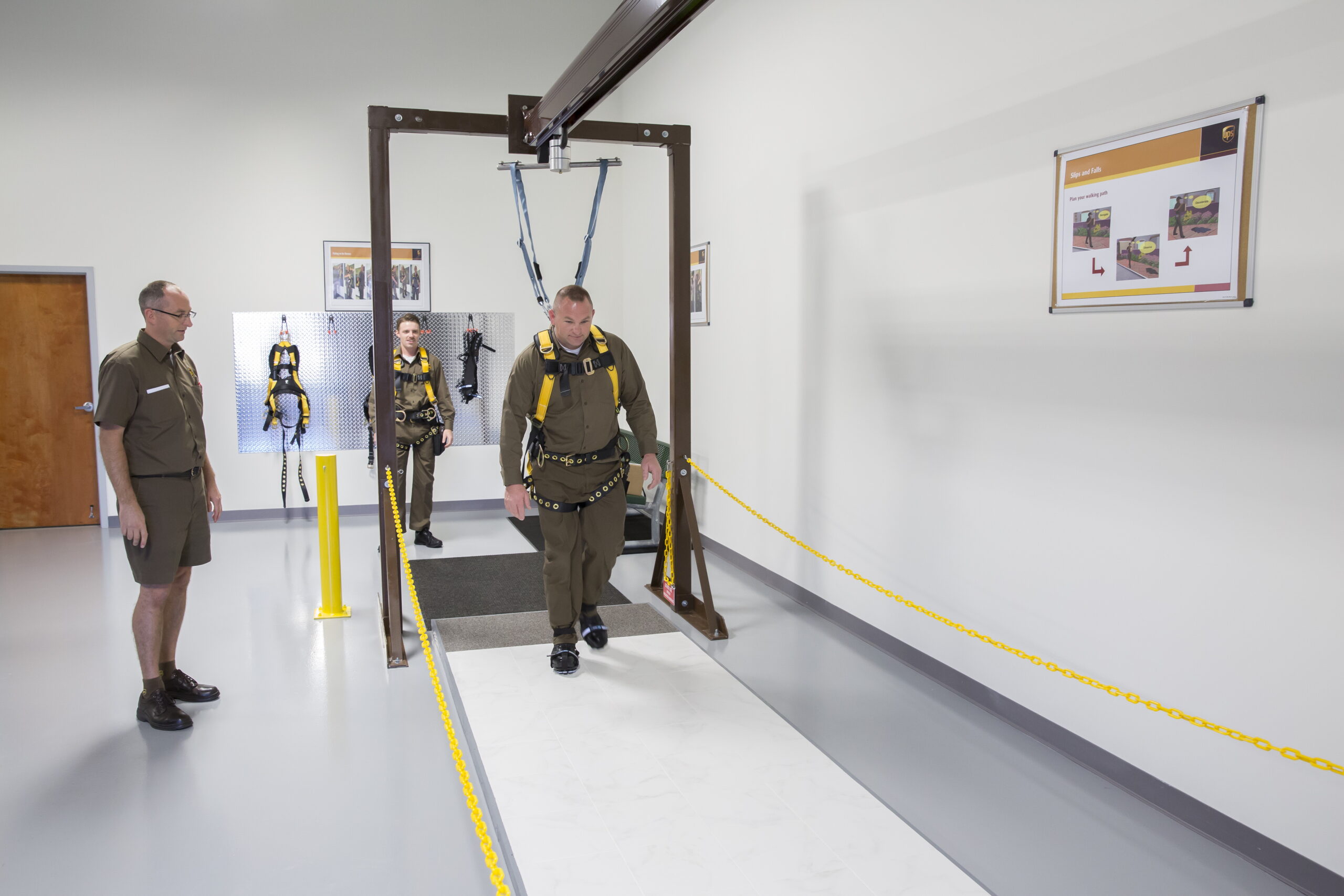 Immer noch in der Halle werden auf einer eigens präparierten Fläche rutschige Verhältnisse, wie Eis oder nasses Laub am Boden simuliert. Alle Fahrerinnen und Fahrer erhalten von UPS verstellbare Überschuhe mit speziell präparierten Sohlen. Aber auch damit will das richtige Laufen gelernt sein. Entscheidend dabei sind die Schritte. «Trippelschritte wie, übertrieben gesagt, bei den Pinguinen, geben dabei die grösstmögliche Sicherheit», erklärt Lieschke.
