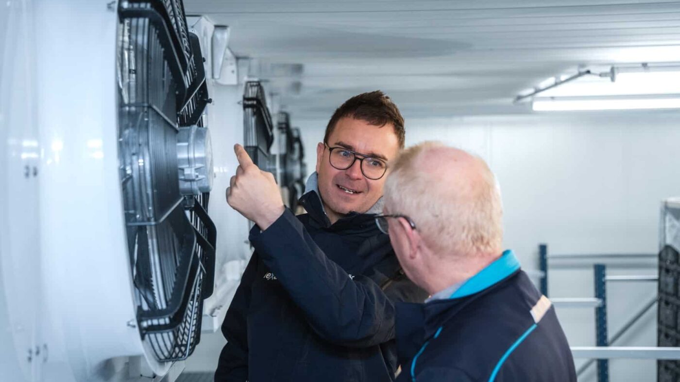 Foto: © Philipp Eigner / flexality GmbH / Bildlegende: fleXality-Geschäftsführer Sören Eilenberger (links im Bild) erläutert die Einsparpotenziale der Kühlanlage direkt vor Ort im Tiefkühllager eines Kunden