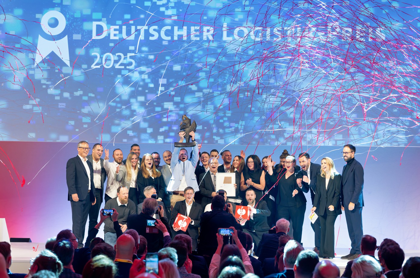 Die Mitarbeiter von Strauss feiern den Gewinn beim Deutschen Logistik-Preis. COO Matthias Fischer (Mitte) hält die Siegesurkunde